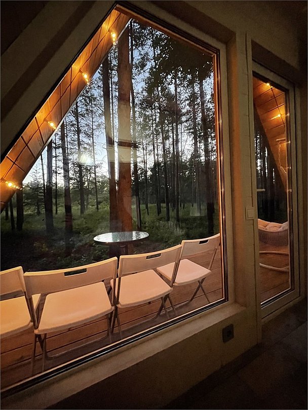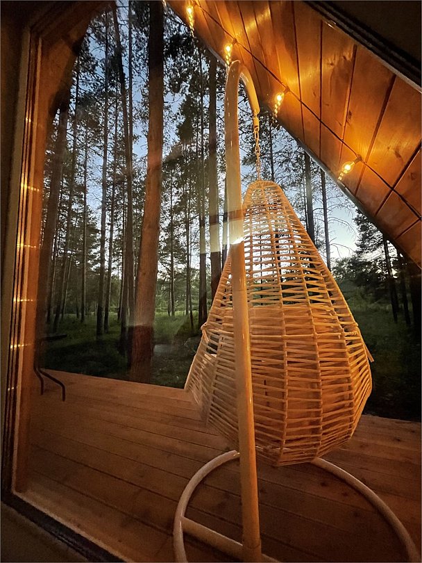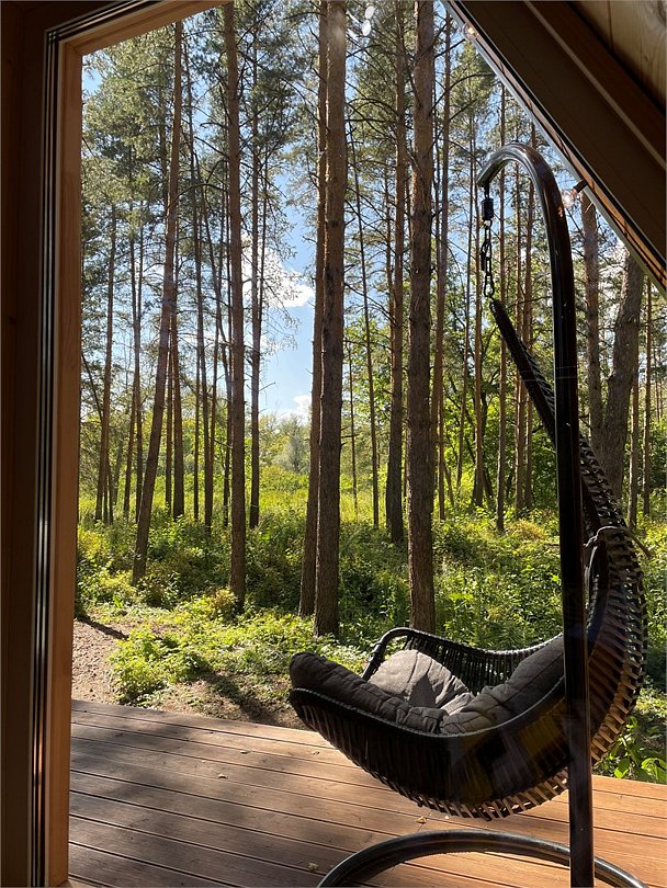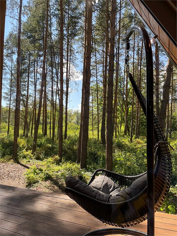 С террасы открывается живописный вид на сосновый лес и закат! На террасе для Вас стол и стулья, кресло-качели, вечерняя подсветка. Индивидуальная мангальная зона с принадлежностями рядом с домом.