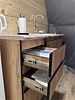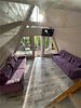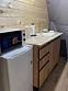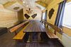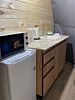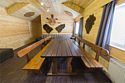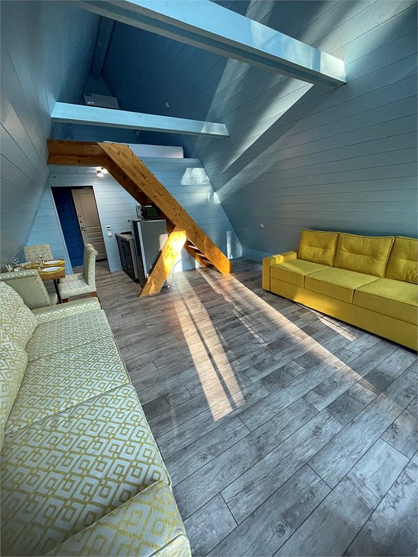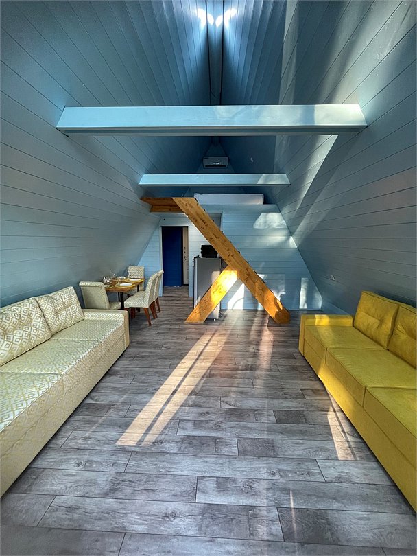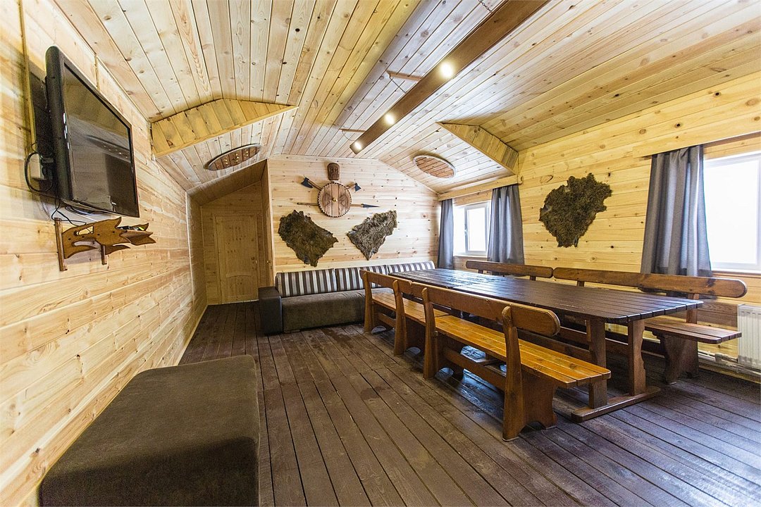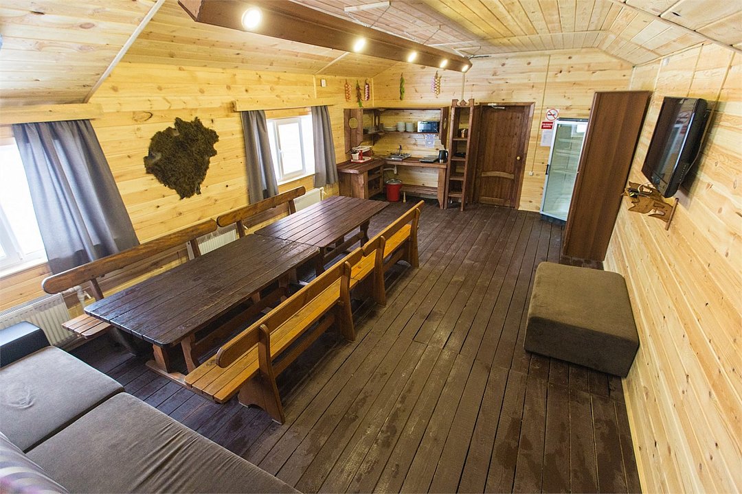 Второй этаж оборудован просторной гостиной с уютной зоной для трапез, удобными столами и скамейками. Здесь также имеется кухонная зона с микроволновой печью, холодильником и кухонными принадлежностями, а для развлечений предусмотрен телевизор.