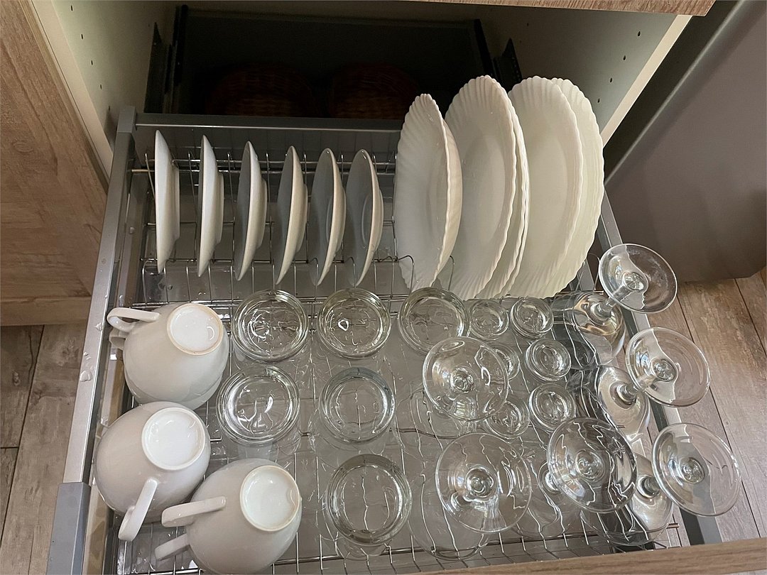 В доме: два этажа, четыре спальных комнаты, гостиная и сауна. На первом этаже находится гостиная с большим телевизором (Smart‑TV) и кондиционером. В кухонной зоне есть холодильник, электрочайник, микроволновая печь, комплект посуды на шестнадцать персон, обеденный стол и стулья.