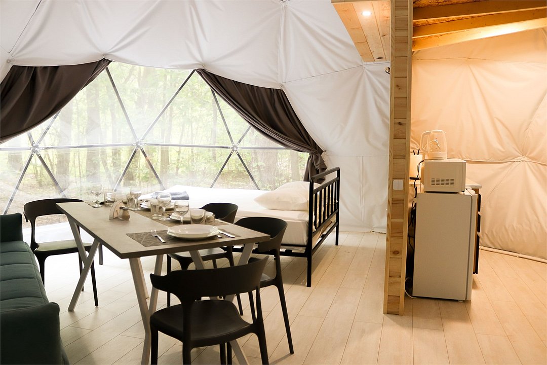 Удобства: тропический душ, санузел, раковина, фен, сауна в помещении на восемь человек, умывальные принадлежности. На террасе: стол, стулья, мангальная зона, подвесное кресло, сибирский банный чан. Дополнительно: тапочки, полотенца, Wi‑Fi.