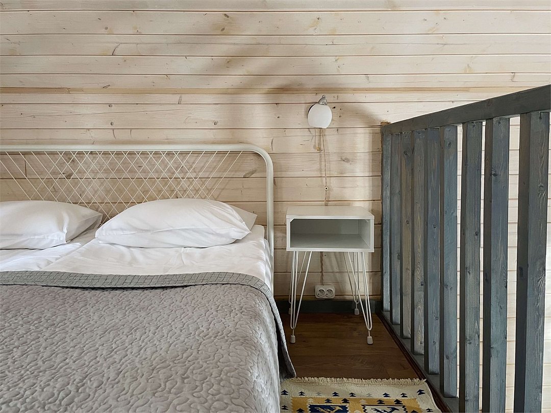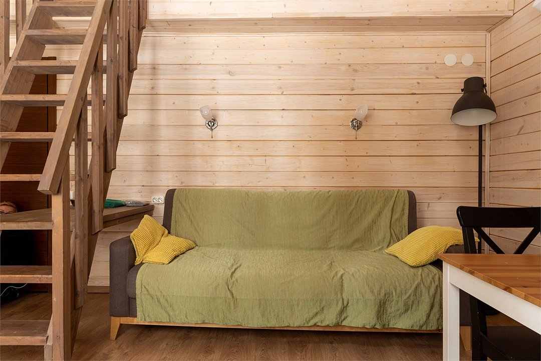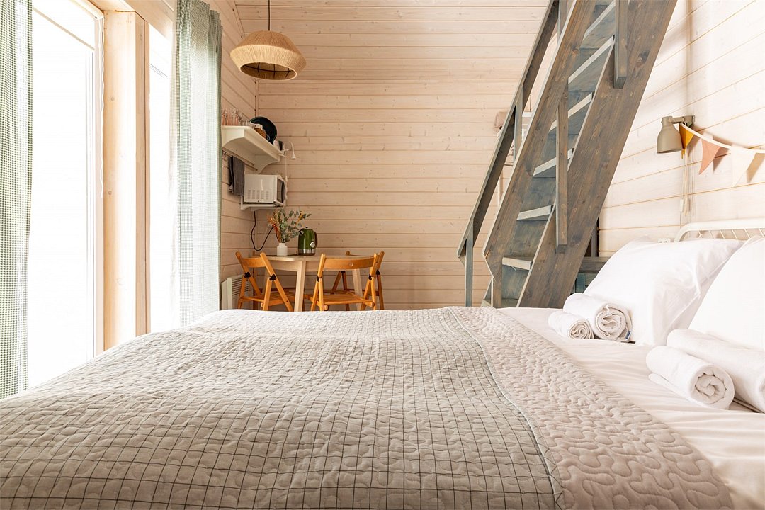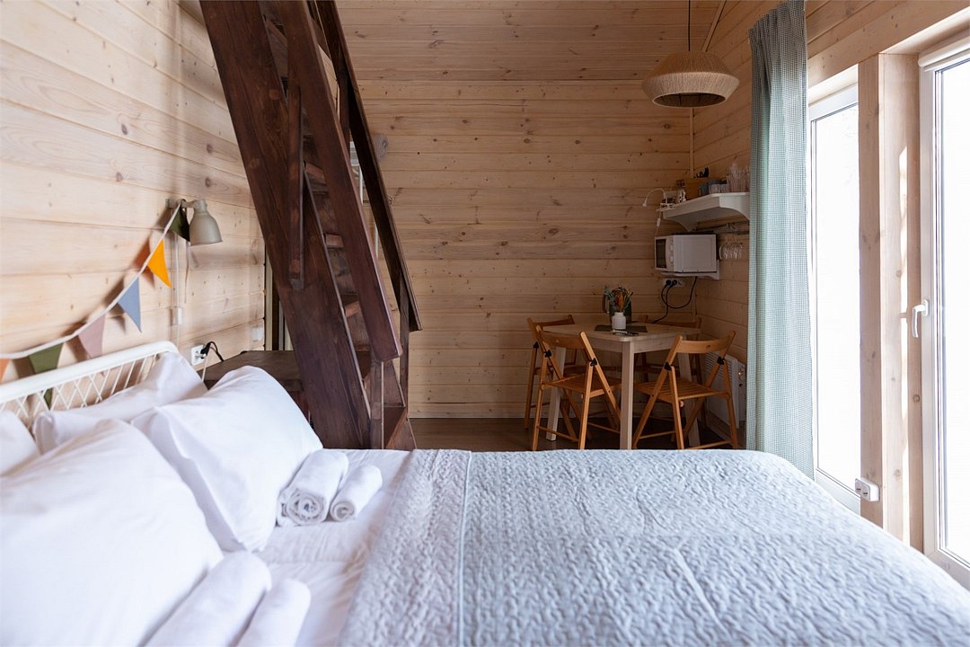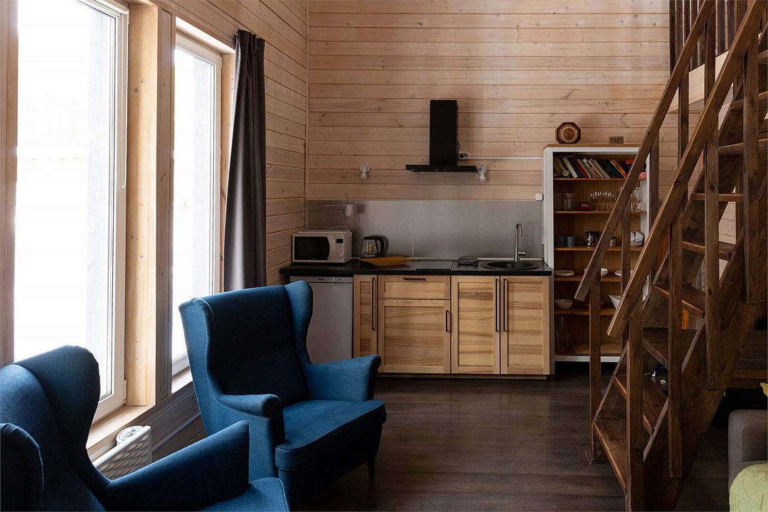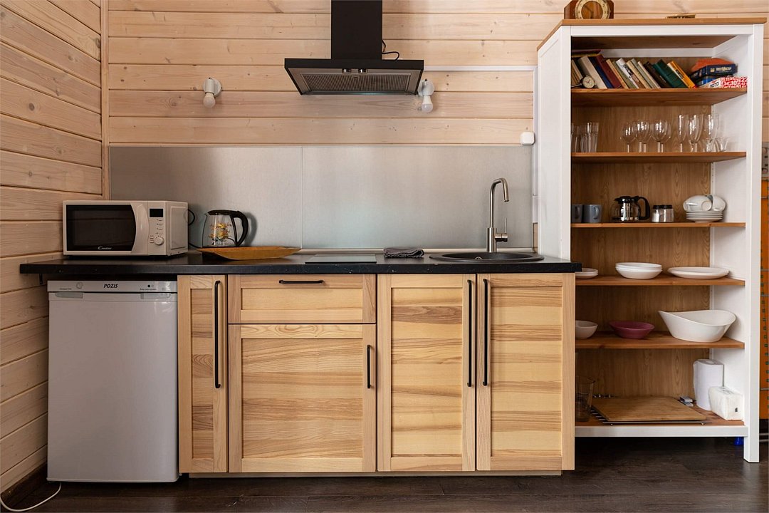 ■ двухэтажный дом с кухней ■ двуспальная кровать + раскладной диван ■ кухня: мини-холодильник, варочная панель, электрический чайник, микроволновка, посуда и приборы для готовки и сервировки ■ сауна в доме ■ до 4 гостей Здесь могут разместиться до 4 человек. Основное спальное место — двуспальная кровать на втором этаже. Диван на первом этаже в гостиной раскладывается в еще одно спальное место на двоих. ❗Обратите внимание, что лестница, которая ведет на второй этаж, довольно крутая и подойдет не всем. В доме есть вся необходимая техника и посуда для приготовления и сервировки. Кухня оборудована мини-холодильником, варочной панелью, электрическим чайником и микроволновкой. На раковине есть кран с питьевой водой из фильтра. Ванная комната с туалетом, душевой кабиной, теплым полом. В ванной есть фен, по два полотенца для каждого гостя, жидкое мыло и гель для душа. Прямо в доме небольшая сауна, в нее можно пройти через ванную комнату. Около дома есть своя площадка с мангалом и столом для пикника, если вы захотите приготовить барбекю. Время заезда и выезда: ▸ check-in с 15:00 ▸ check-out до 12:00Услуги и удобства