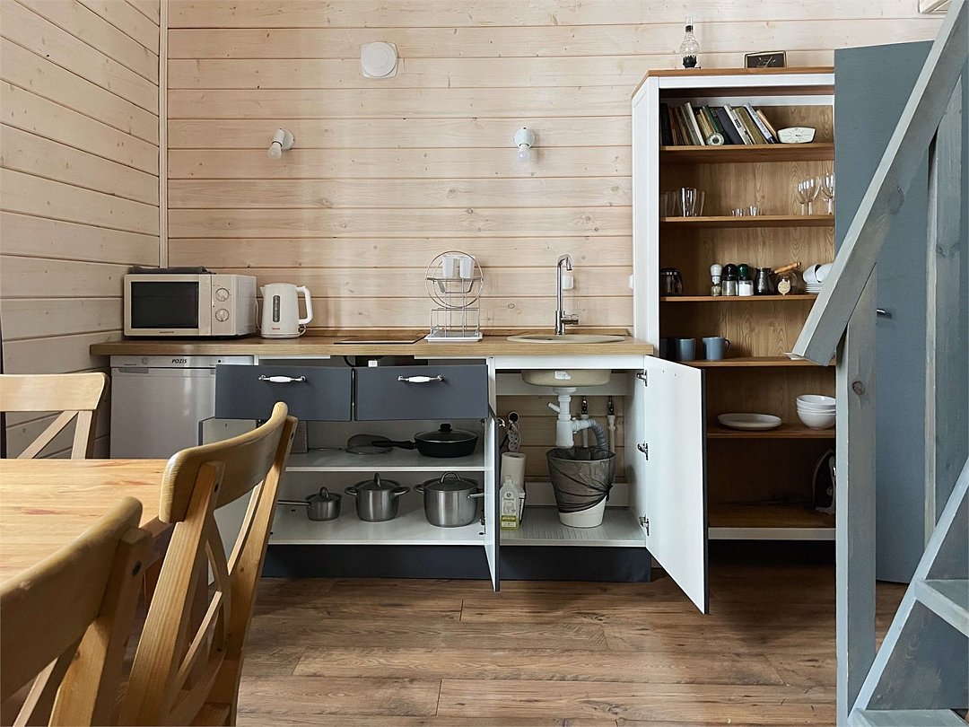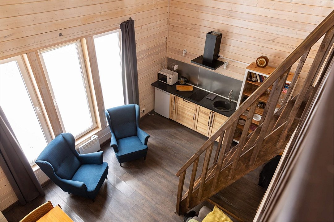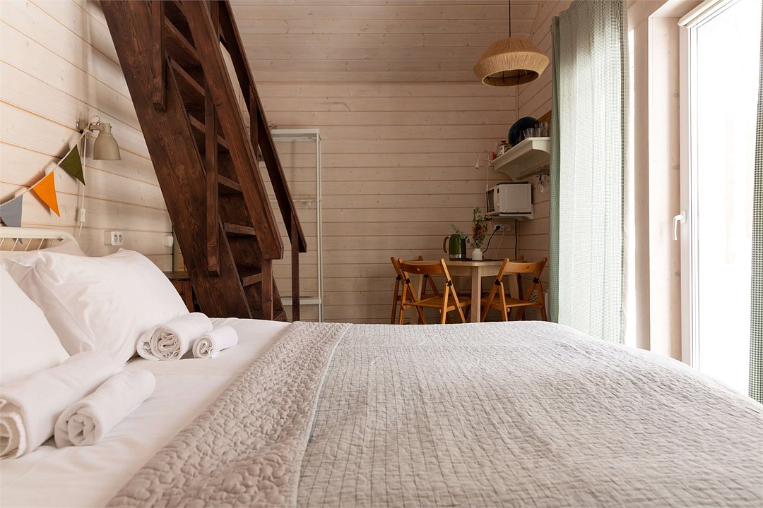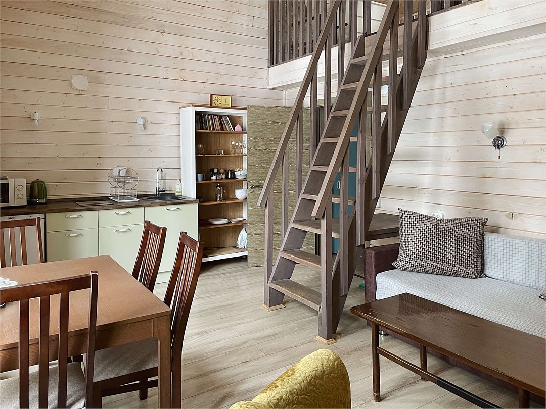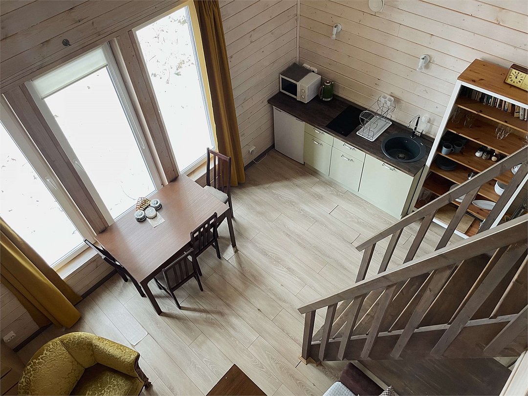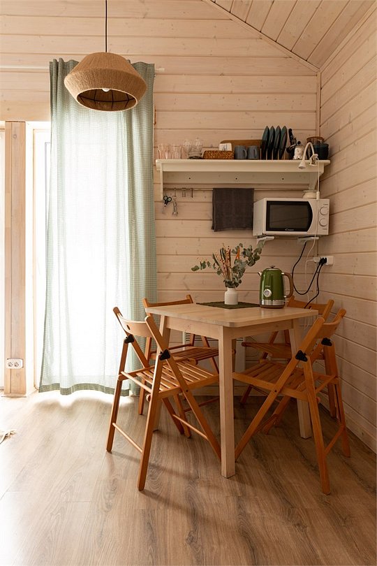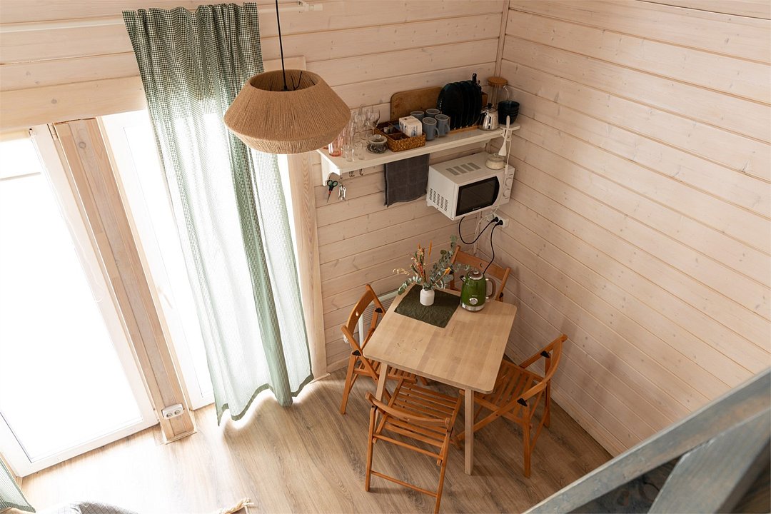 ■ двухэтажный дом с кухней ■ двуспальная кровать + раскладной диван ■ кухня: мини-холодильник, варочная панель, электрический чайник, микроволновка, посуда и приборы для готовки и сервировки ■ сауна в доме ■ до 4 гостей Здесь могут разместиться до 4 человек. Основное спальное место — двуспальная кровать на втором этаже. Диван на первом этаже в гостиной раскладывается в еще одно спальное место на двоих. ❗Обратите внимание, что лестница, которая ведет на второй этаж, довольно крутая и подойдет не всем. В доме есть вся необходимая техника и посуда для приготовления и сервировки. Кухня оборудована мини-холодильником, варочной панелью, электрическим чайником и микроволновкой. На раковине есть кран с питьевой водой из фильтра. Ванная комната с туалетом, душевой кабиной, теплым полом. В ванной есть фен, по два полотенца для каждого гостя, жидкое мыло и гель для душа. Прямо в доме небольшая сауна, в нее можно пройти через ванную комнату. Около дома есть своя площадка с мангалом и столом для пикника, если вы захотите приготовить барбекю. Время заезда и выезда: ▸ check-in с 15:00 ▸ check-out до 12:00Услуги и удобства