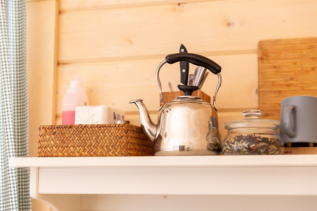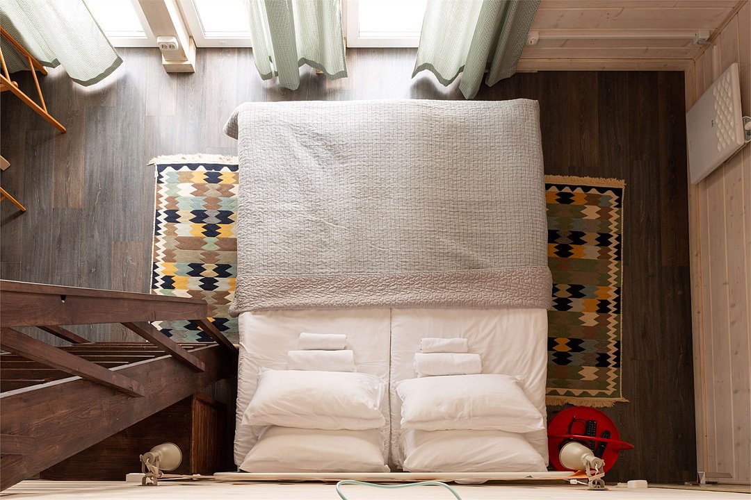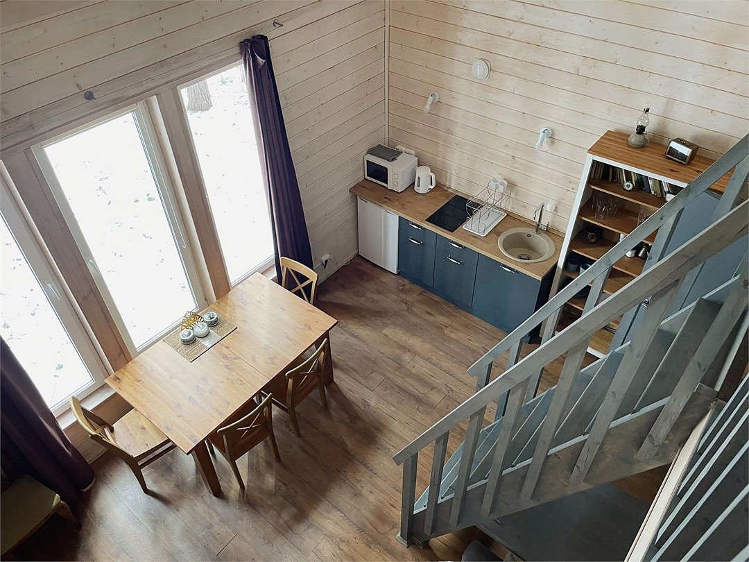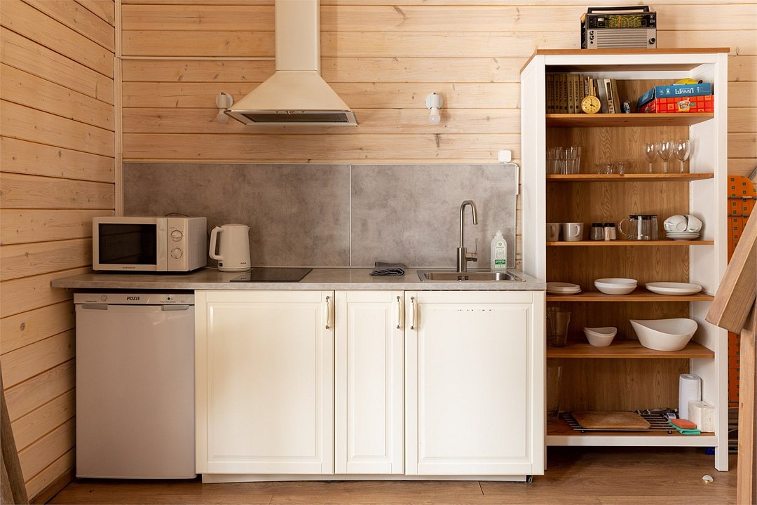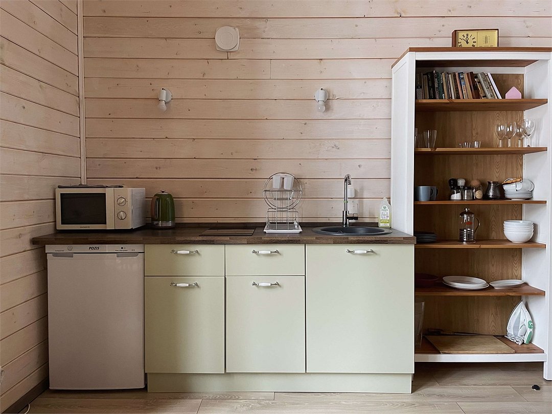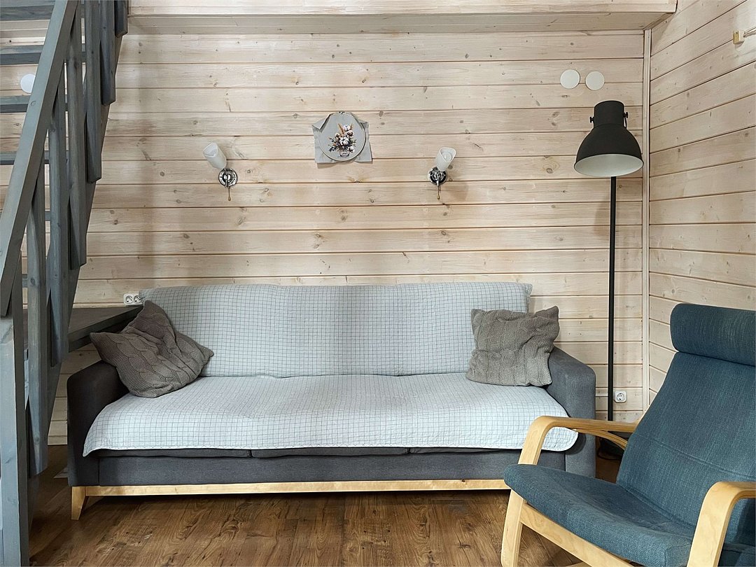 ■ двухэтажный дом с кухней ■ двуспальная кровать + раскладной диван ■ кухня: мини-холодильник, варочная панель, электрический чайник, микроволновка, посуда и приборы для готовки и сервировки ■ сауна в доме ■ до 4 гостей Здесь могут разместиться до 4 человек. Основное спальное место — двуспальная кровать на втором этаже. Диван на первом этаже в гостиной раскладывается в еще одно спальное место на двоих. ❗Обратите внимание, что лестница, которая ведет на второй этаж, довольно крутая и подойдет не всем. В доме есть вся необходимая техника и посуда для приготовления и сервировки. Кухня оборудована мини-холодильником, варочной панелью, электрическим чайником и микроволновкой. На раковине есть кран с питьевой водой из фильтра. Ванная комната с туалетом, душевой кабиной, теплым полом. В ванной есть фен, по два полотенца для каждого гостя, жидкое мыло и гель для душа. Прямо в доме небольшая сауна, в нее можно пройти через ванную комнату. Около дома есть своя площадка с мангалом и столом для пикника, если вы захотите приготовить барбекю. Время заезда и выезда: ▸ check-in с 15:00 ▸ check-out до 12:00Услуги и удобства