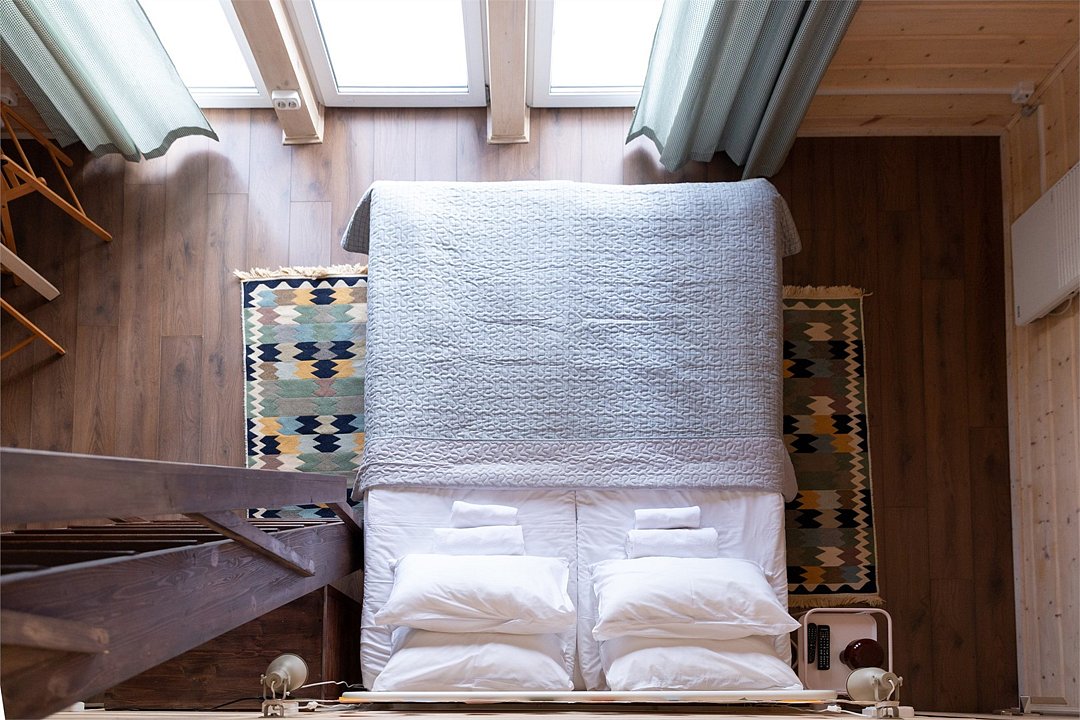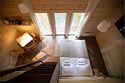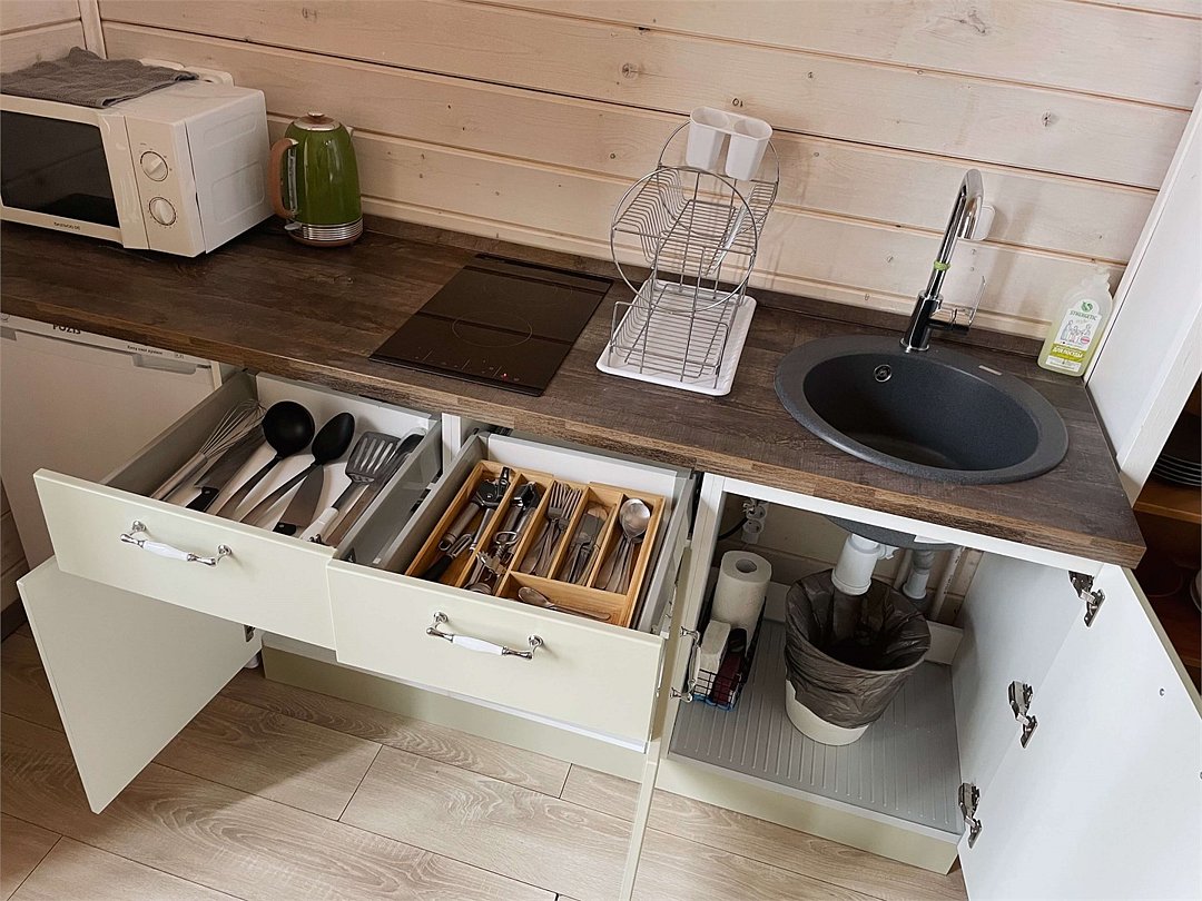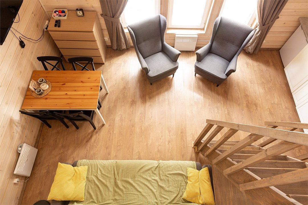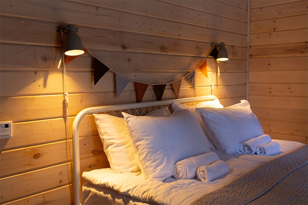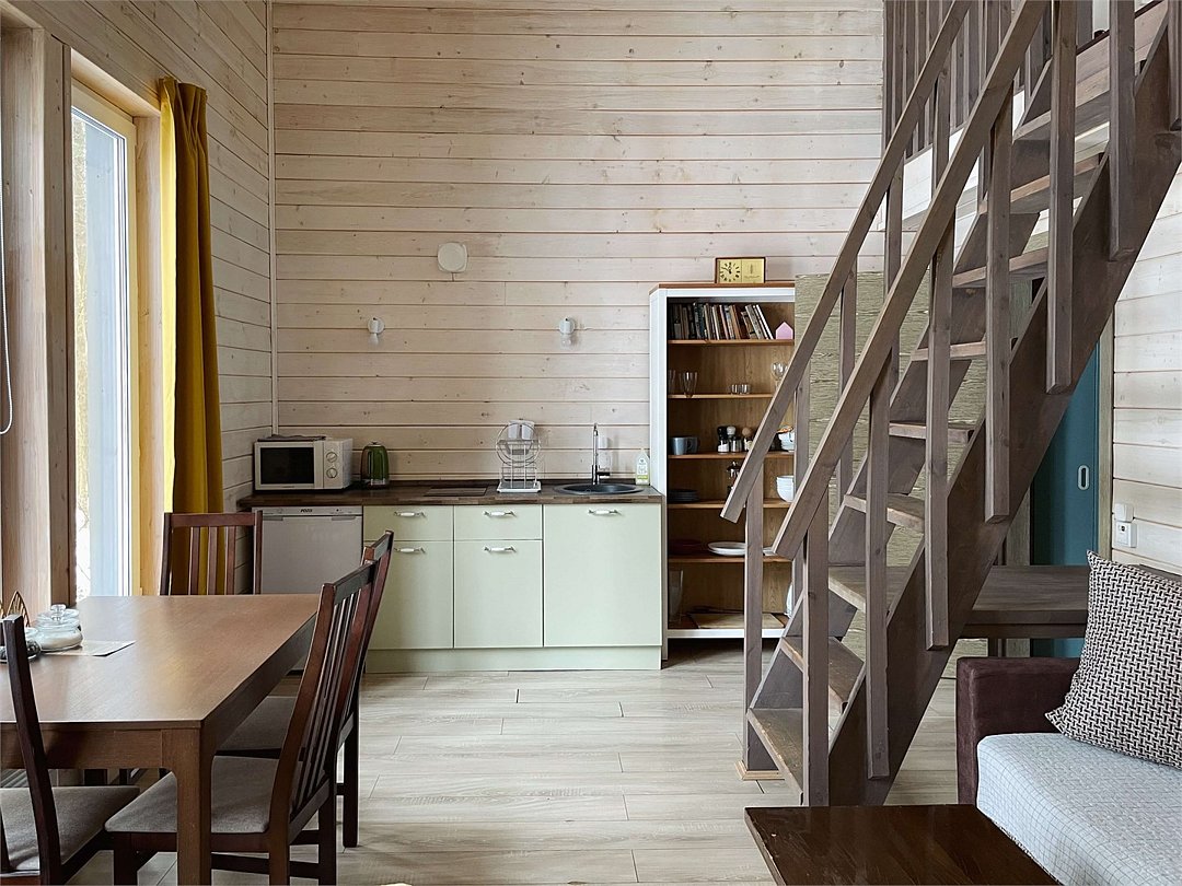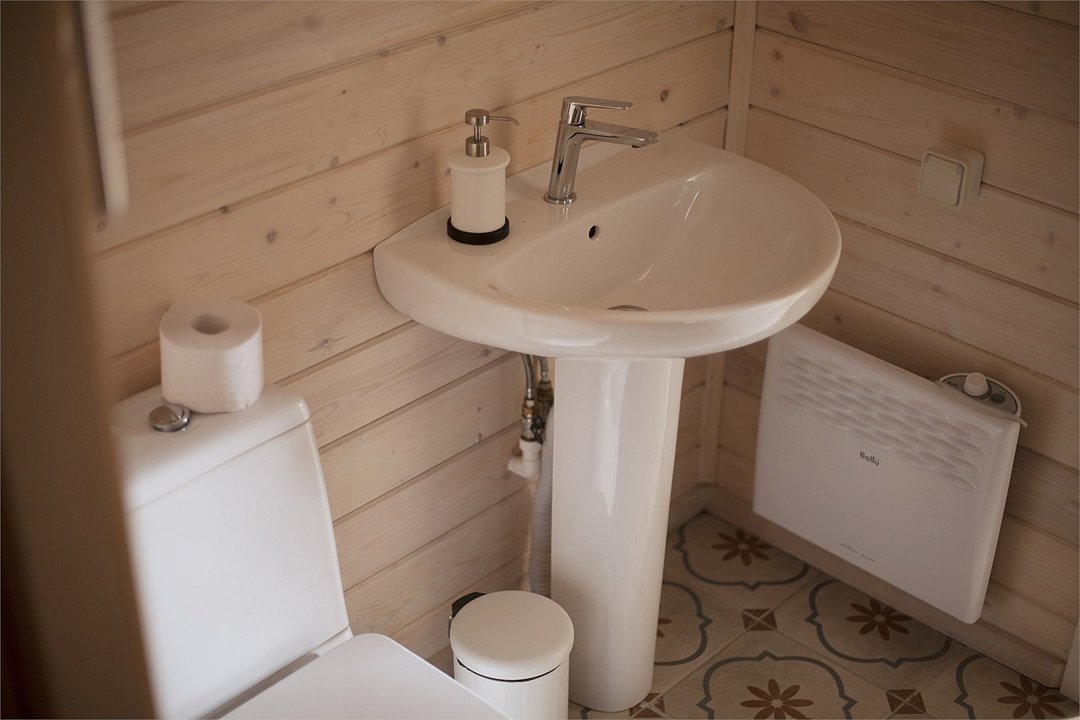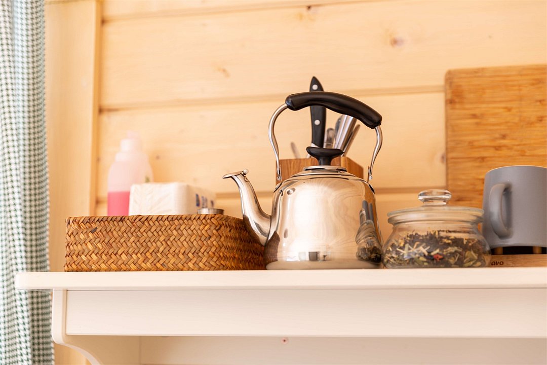 ■ двухэтажный дом с кухней ■ двуспальная кровать + раскладной диван ■ кухня: мини-холодильник, варочная панель, электрический чайник, микроволновка, посуда и приборы для готовки и сервировки ■ сауна в доме ■ до 4 гостей Здесь могут разместиться до 4 человек. Основное спальное место — двуспальная кровать на втором этаже. Диван на первом этаже в гостиной раскладывается в еще одно спальное место на двоих. ❗Обратите внимание, что лестница, которая ведет на второй этаж, довольно крутая и подойдет не всем. В доме есть вся необходимая техника и посуда для приготовления и сервировки. Кухня оборудована мини-холодильником, варочной панелью, электрическим чайником и микроволновкой. На раковине есть кран с питьевой водой из фильтра. Ванная комната с туалетом, душевой кабиной, теплым полом. В ванной есть фен, по два полотенца для каждого гостя, жидкое мыло и гель для душа. Прямо в доме небольшая сауна, в нее можно пройти через ванную комнату. Около дома есть своя площадка с мангалом и столом для пикника, если вы захотите приготовить барбекю. Время заезда и выезда: ▸ check-in с 15:00 ▸ check-out до 12:00Услуги и удобства