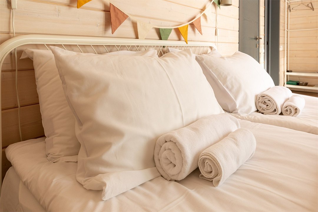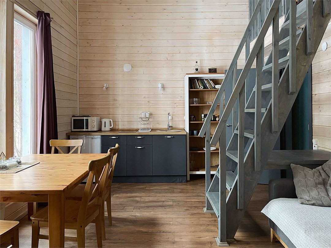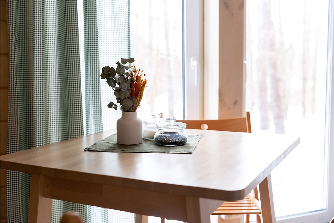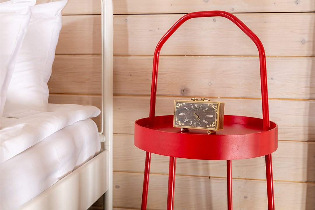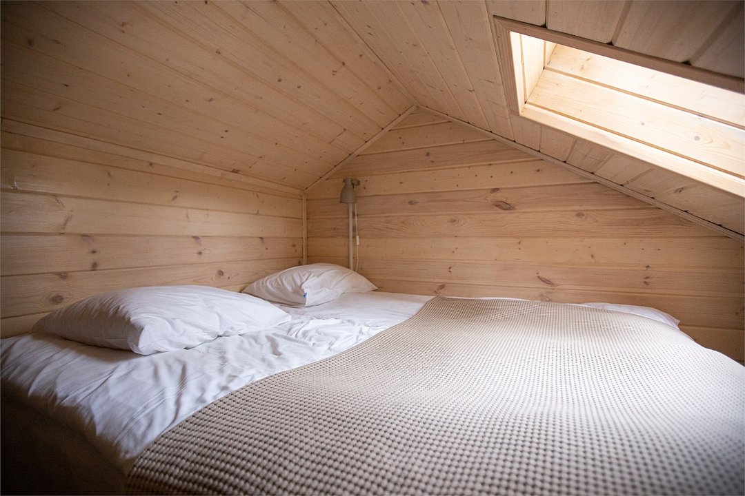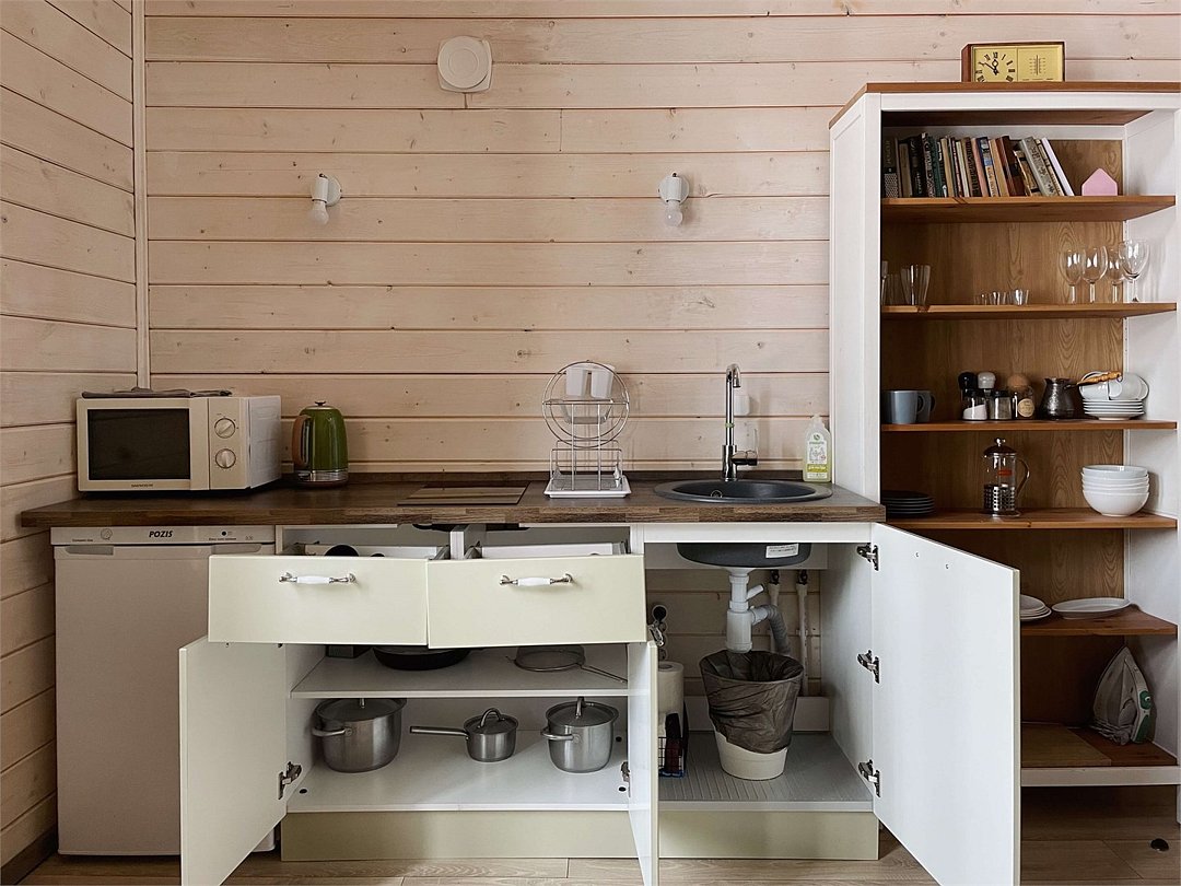 ■ двухэтажный дом с кухней ■ двуспальная кровать + раскладной диван ■ кухня: мини-холодильник, варочная панель, электрический чайник, микроволновка, посуда и приборы для готовки и сервировки ■ сауна в доме ■ до 4 гостей Здесь могут разместиться до 4 человек. Основное спальное место — двуспальная кровать на втором этаже. Диван на первом этаже в гостиной раскладывается в еще одно спальное место на двоих. ❗Обратите внимание, что лестница, которая ведет на второй этаж, довольно крутая и подойдет не всем. В доме есть вся необходимая техника и посуда для приготовления и сервировки. Кухня оборудована мини-холодильником, варочной панелью, электрическим чайником и микроволновкой. На раковине есть кран с питьевой водой из фильтра. Ванная комната с туалетом, душевой кабиной, теплым полом. В ванной есть фен, по два полотенца для каждого гостя, жидкое мыло и гель для душа. Прямо в доме небольшая сауна, в нее можно пройти через ванную комнату. Около дома есть своя площадка с мангалом и столом для пикника, если вы захотите приготовить барбекю. Время заезда и выезда: ▸ check-in с 15:00 ▸ check-out до 12:00Услуги и удобства