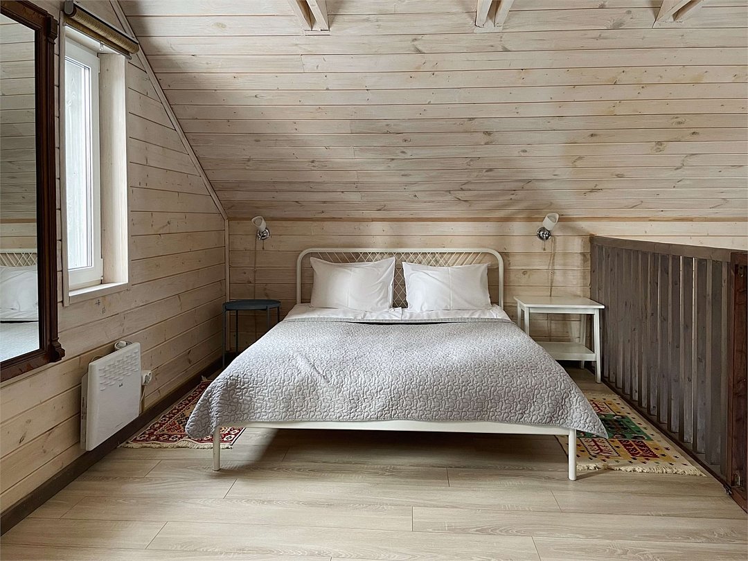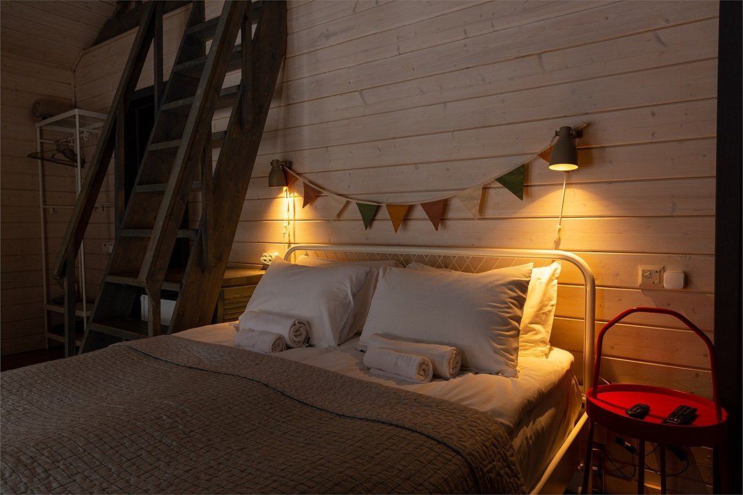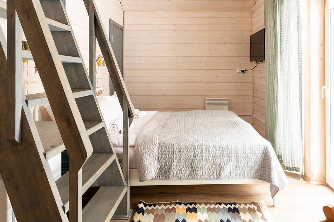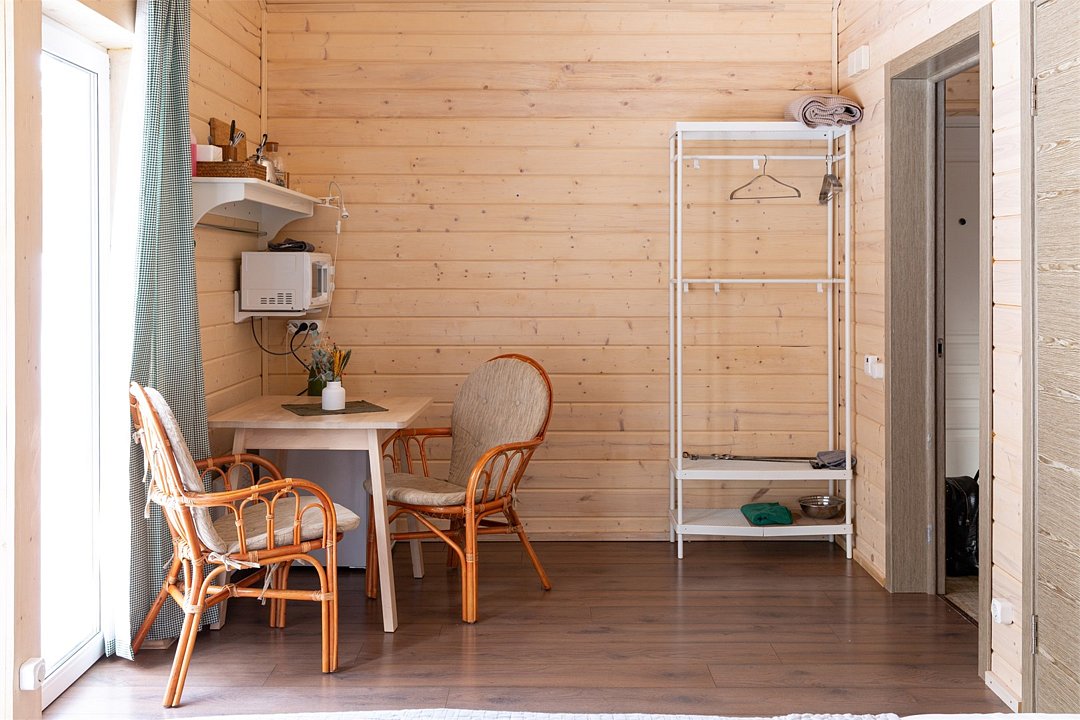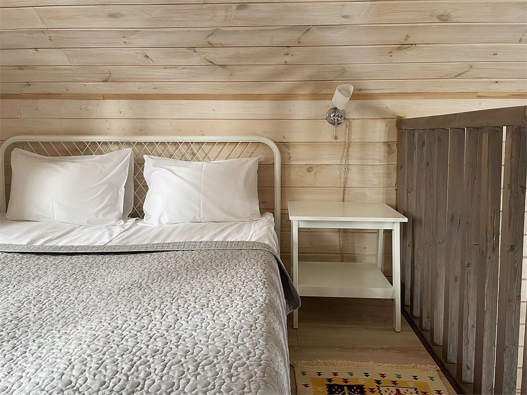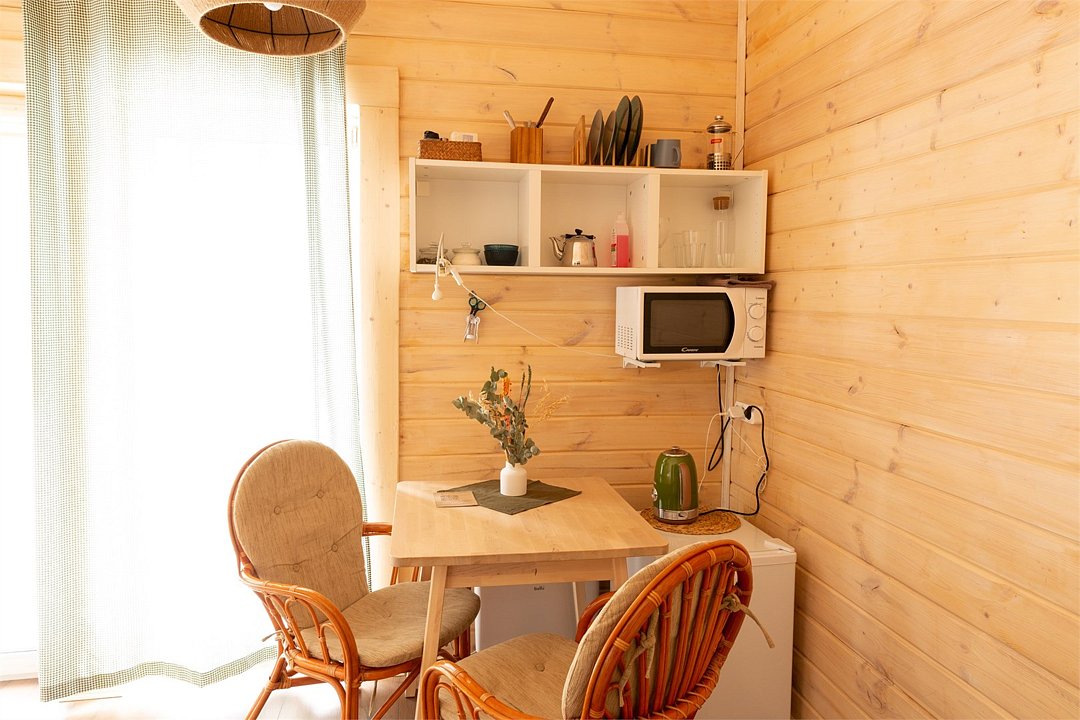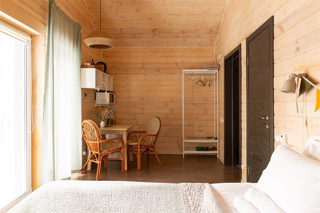 ■ одна из двух комнат в одном домике ■ кухонный уголок: мини-холодильник, микроволновка, электрический чайник, посуда и приборы ■ двуспальная кровать + спальное место на антресоли ■ ванная комната с душевой кабиной ■ до 4 гостей В одном домике находятся две комнаты с общей прихожей. Одна комната — дабл, другая — с антресолью. В комнате антресолью могут разместиться до 4 человек, она состоит из жилой комнаты и санузла. По всей комнате теплый пол, температуру можно регулировать. Двуспальная кровать с удобным матрасом расположена напротив больших окон в пол с видом на лес. Еще одно спальное место — на антресоли под крышей. ❗Обратите внимание, что лестница, которая ведет на антресоль, довольно крутая и подойдет не всем. Кухонный уголок оснащен мини-холодильником, микроволновкой, электрическим чайником и набором чайной посуды. Есть обеденный стол и четыре стула. Ванная комната с туалетом, душевой кабиной, теплым полом. В ванной есть фен, по два полотенца для каждого гостя, жидкое мыло и гель для душа. Около каждого домика есть площадка с мангалом и столом для пикника (мангал общий, на обе комнаты). ❗У этой комнаты смежная стена с другой комнатой в домике. В деревянных домах слышимость отличается от привычной городской, и это может быть некомфортно для людей с чутким сном. Пожалуйста, будьте внимательны к другим гостям, соблюдайте тихий час после 22:00. Если важна уединенность, лучше выбрать отдельный дом (Брусника, Клюква, Черника, Морошка). Время заезда и выезда: ▸ check-in с 15:00 ▸ check-out до 12:00Услуги и удобства
