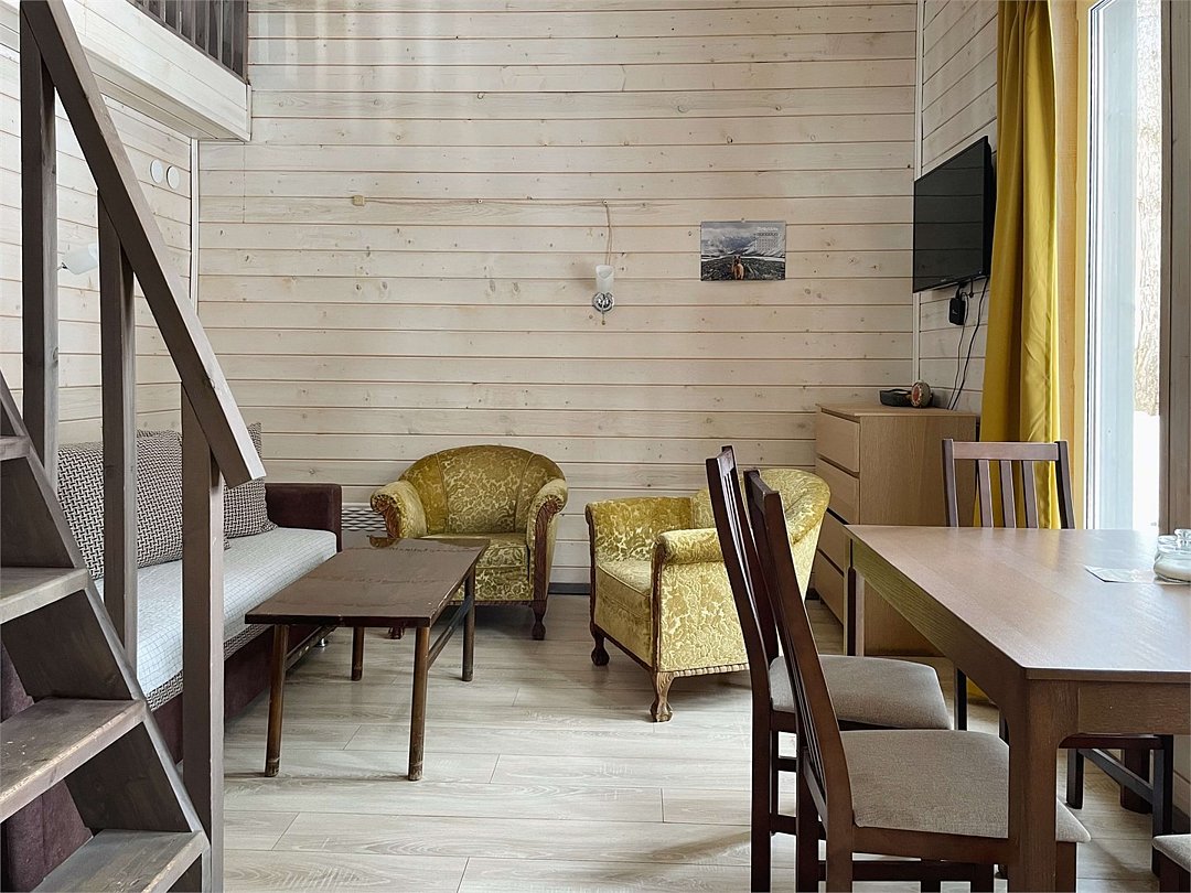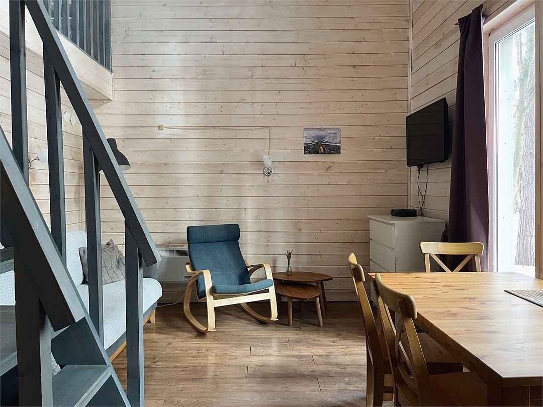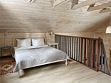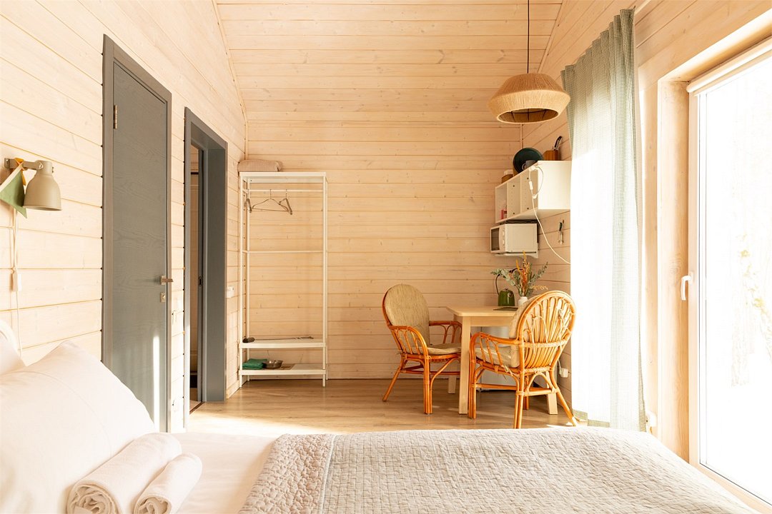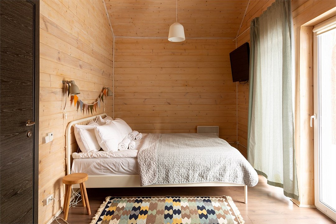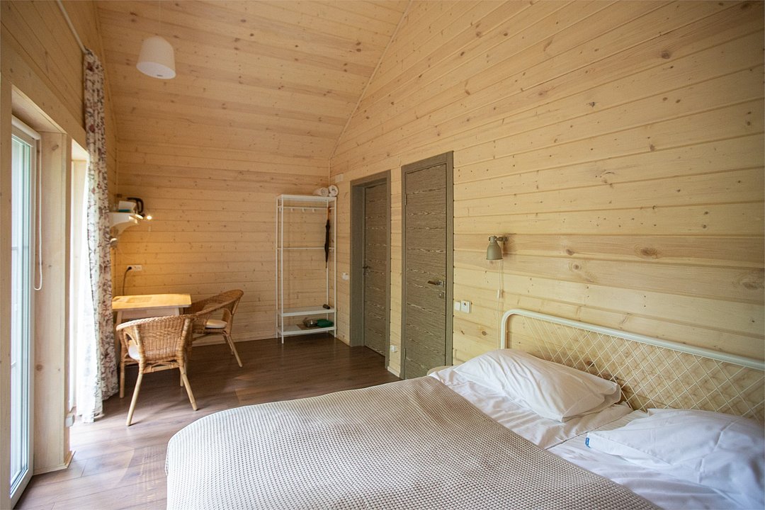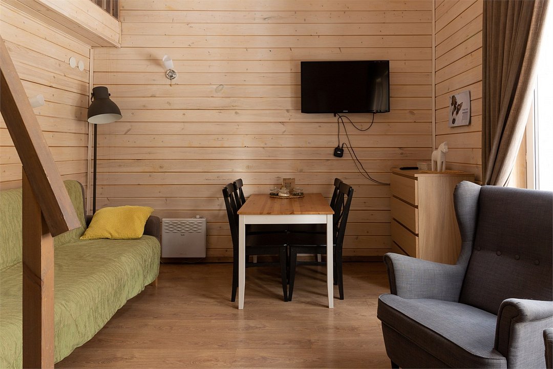 ■ одна из двух комнат в одном домике ■ кухонный уголок: мини-холодильник, микроволновка, электрический чайник, посуда и приборы ■ двуспальная кровать + спальное место на антресоли ■ ванная комната с душевой кабиной ■ до 4 гостей В одном домике находятся две комнаты с общей прихожей. Одна комната — дабл, другая — с антресолью. В комнате антресолью могут разместиться до 4 человек, она состоит из жилой комнаты и санузла. По всей комнате теплый пол, температуру можно регулировать. Двуспальная кровать с удобным матрасом расположена напротив больших окон в пол с видом на лес. Еще одно спальное место — на антресоли под крышей. ❗Обратите внимание, что лестница, которая ведет на антресоль, довольно крутая и подойдет не всем. Кухонный уголок оснащен мини-холодильником, микроволновкой, электрическим чайником и набором чайной посуды. Есть обеденный стол и четыре стула. Ванная комната с туалетом, душевой кабиной, теплым полом. В ванной есть фен, по два полотенца для каждого гостя, жидкое мыло и гель для душа. Около каждого домика есть площадка с мангалом и столом для пикника (мангал общий, на обе комнаты). ❗У этой комнаты смежная стена с другой комнатой в домике. В деревянных домах слышимость отличается от привычной городской, и это может быть некомфортно для людей с чутким сном. Пожалуйста, будьте внимательны к другим гостям, соблюдайте тихий час после 22:00. Если важна уединенность, лучше выбрать отдельный дом (Брусника, Клюква, Черника, Морошка). Время заезда и выезда: ▸ check-in с 15:00 ▸ check-out до 12:00Услуги и удобства