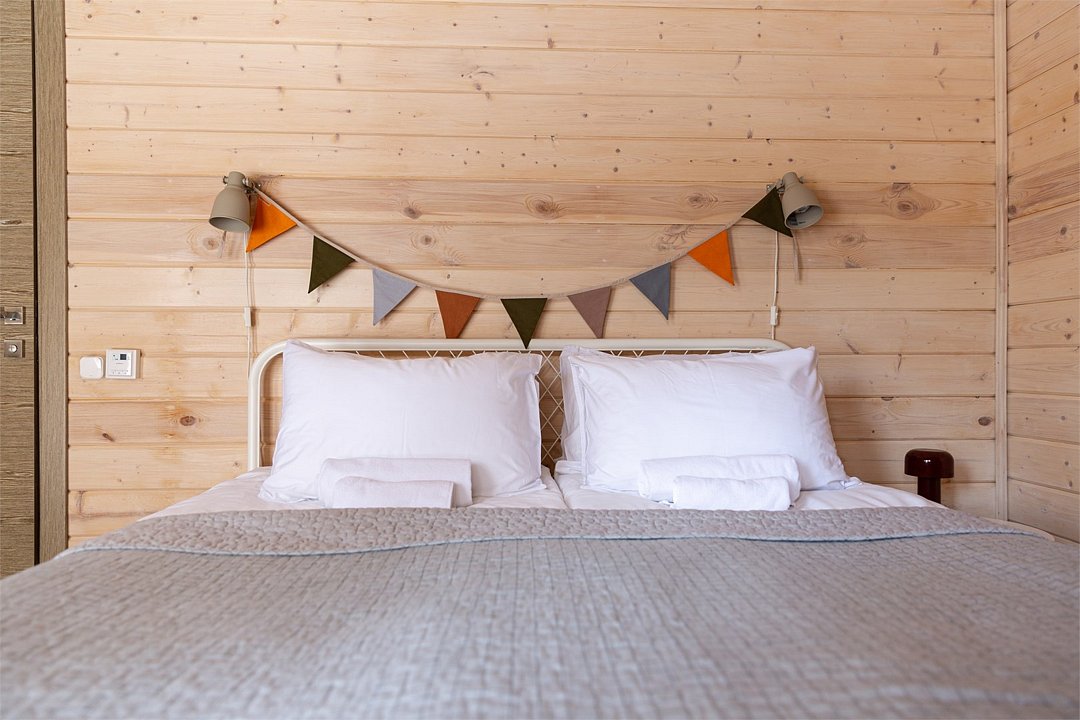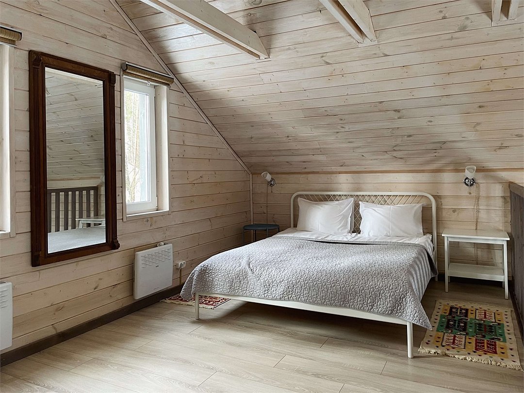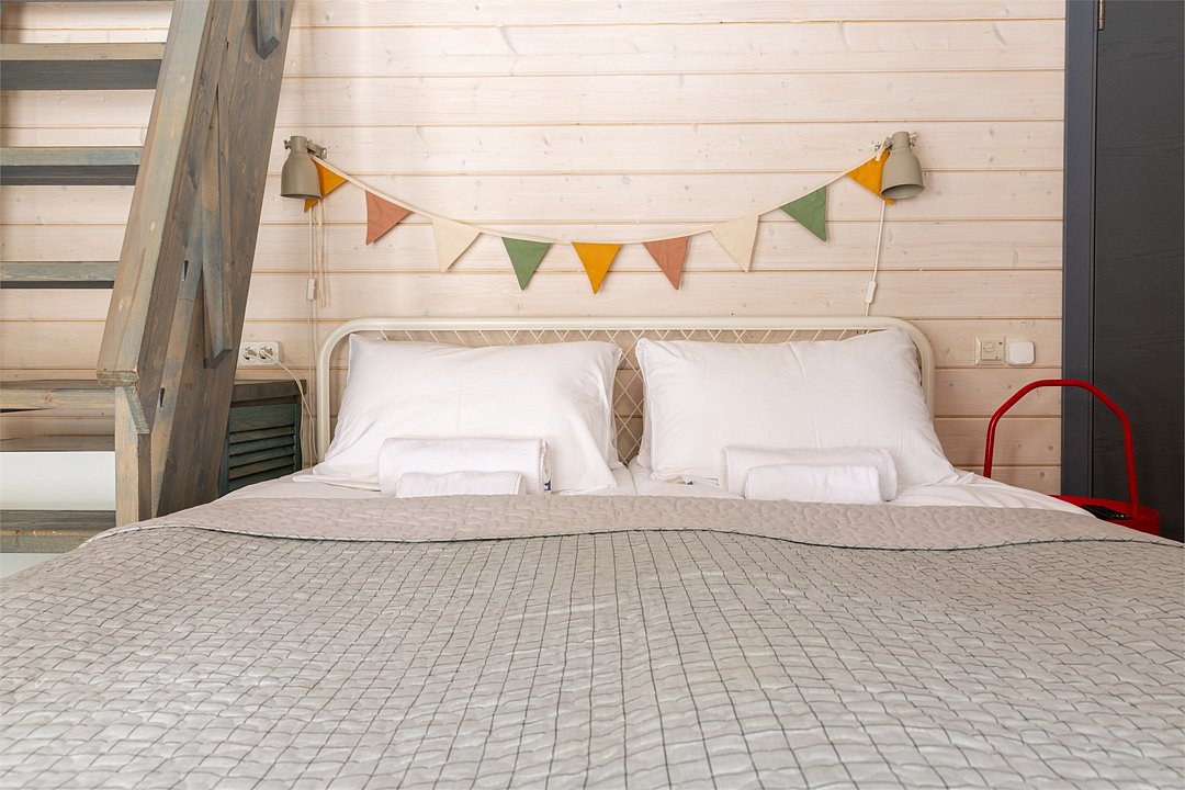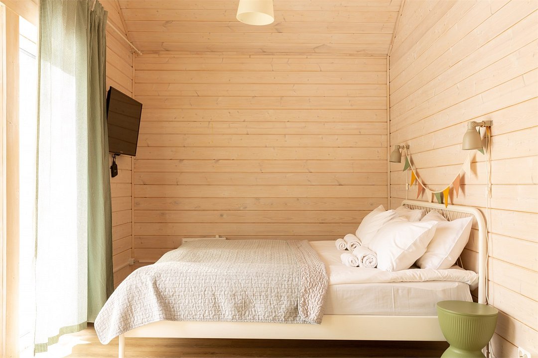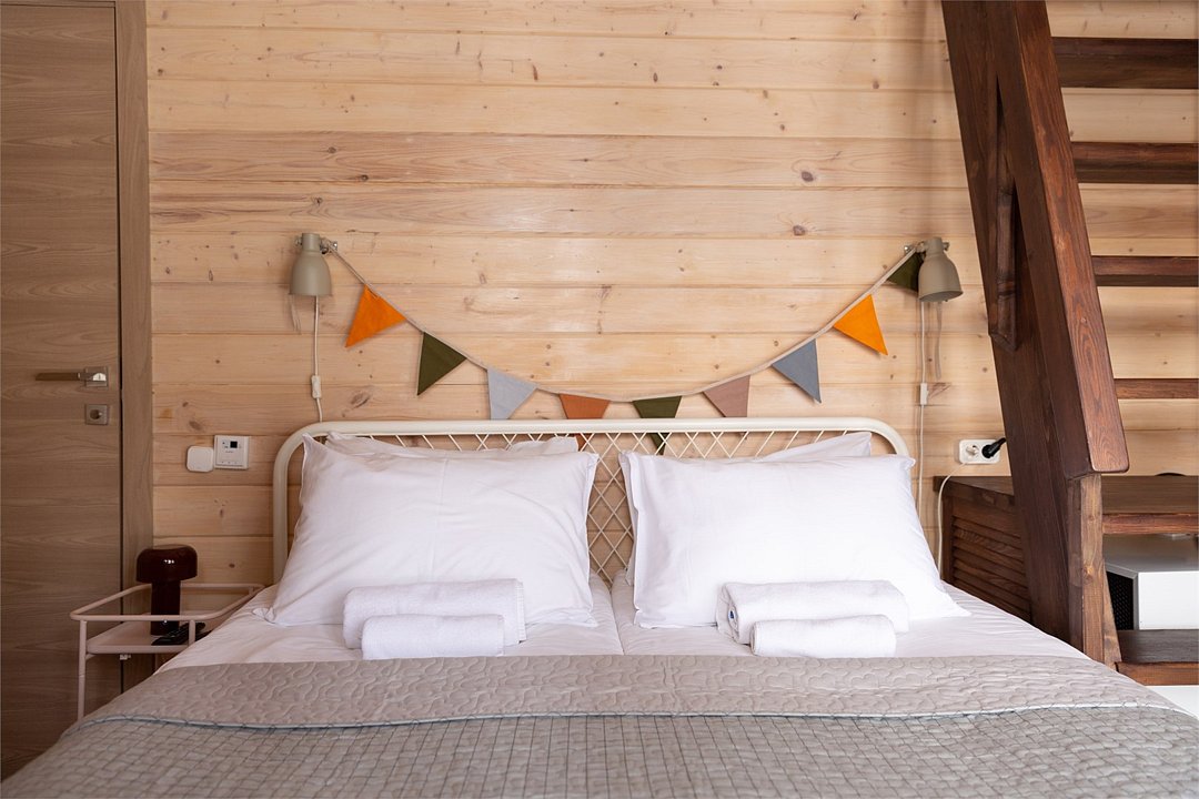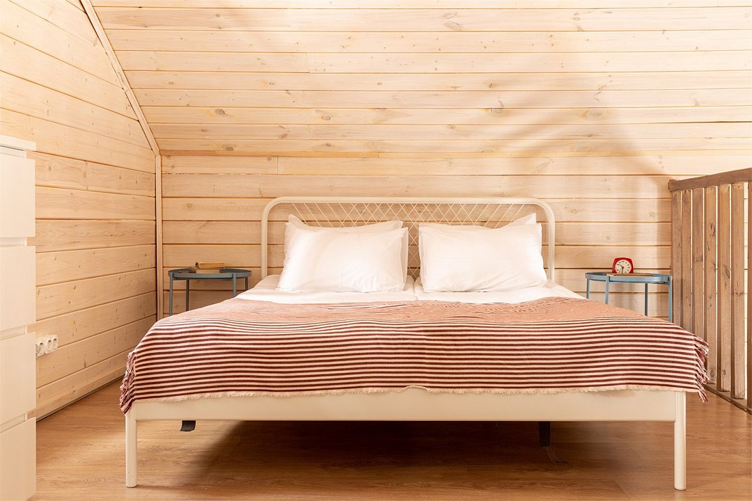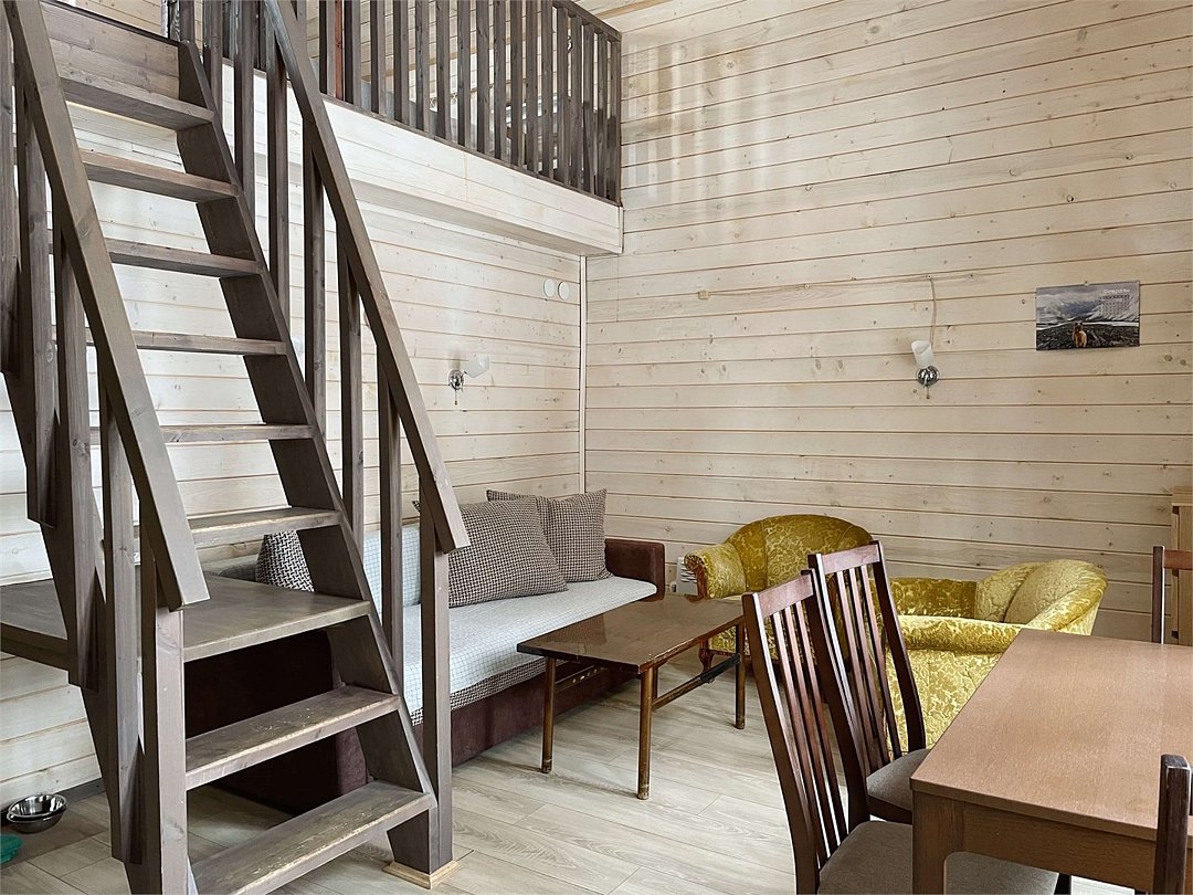 ■ одна из двух комнат в одном домике ■ кухонный уголок: мини-холодильник, микроволновка, электрический чайник, посуда и приборы ■ двуспальная кровать + спальное место на антресоли ■ ванная комната с душевой кабиной ■ до 4 гостей В одном домике находятся две комнаты с общей прихожей. Одна комната — дабл, другая — с антресолью. В комнате антресолью могут разместиться до 4 человек, она состоит из жилой комнаты и санузла. По всей комнате теплый пол, температуру можно регулировать. Двуспальная кровать с удобным матрасом расположена напротив больших окон в пол с видом на лес. Еще одно спальное место — на антресоли под крышей. ❗Обратите внимание, что лестница, которая ведет на антресоль, довольно крутая и подойдет не всем. Кухонный уголок оснащен мини-холодильником, микроволновкой, электрическим чайником и набором чайной посуды. Есть обеденный стол и четыре стула. Ванная комната с туалетом, душевой кабиной, теплым полом. В ванной есть фен, по два полотенца для каждого гостя, жидкое мыло и гель для душа. Около каждого домика есть площадка с мангалом и столом для пикника (мангал общий, на обе комнаты). ❗У этой комнаты смежная стена с другой комнатой в домике. В деревянных домах слышимость отличается от привычной городской, и это может быть некомфортно для людей с чутким сном. Пожалуйста, будьте внимательны к другим гостям, соблюдайте тихий час после 22:00. Если важна уединенность, лучше выбрать отдельный дом (Брусника, Клюква, Черника, Морошка). Время заезда и выезда: ▸ check-in с 15:00 ▸ check-out до 12:00Услуги и удобства