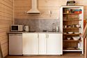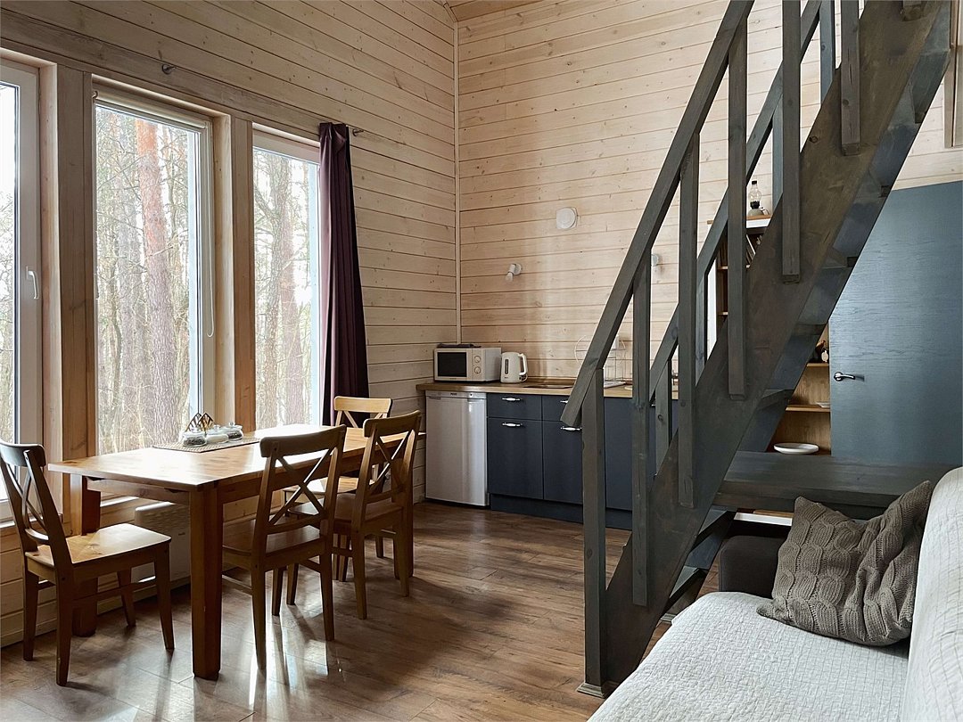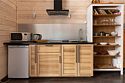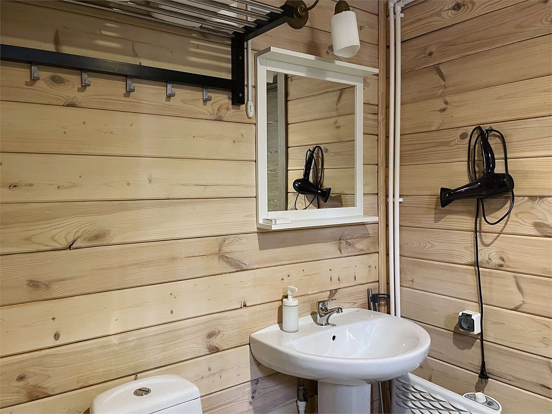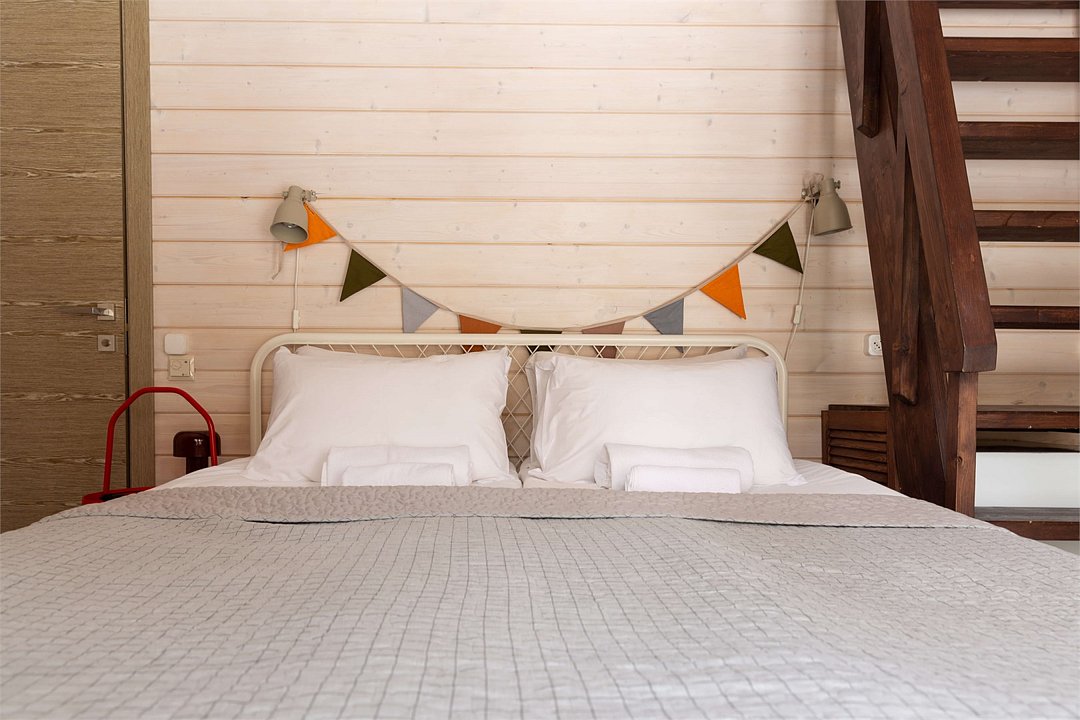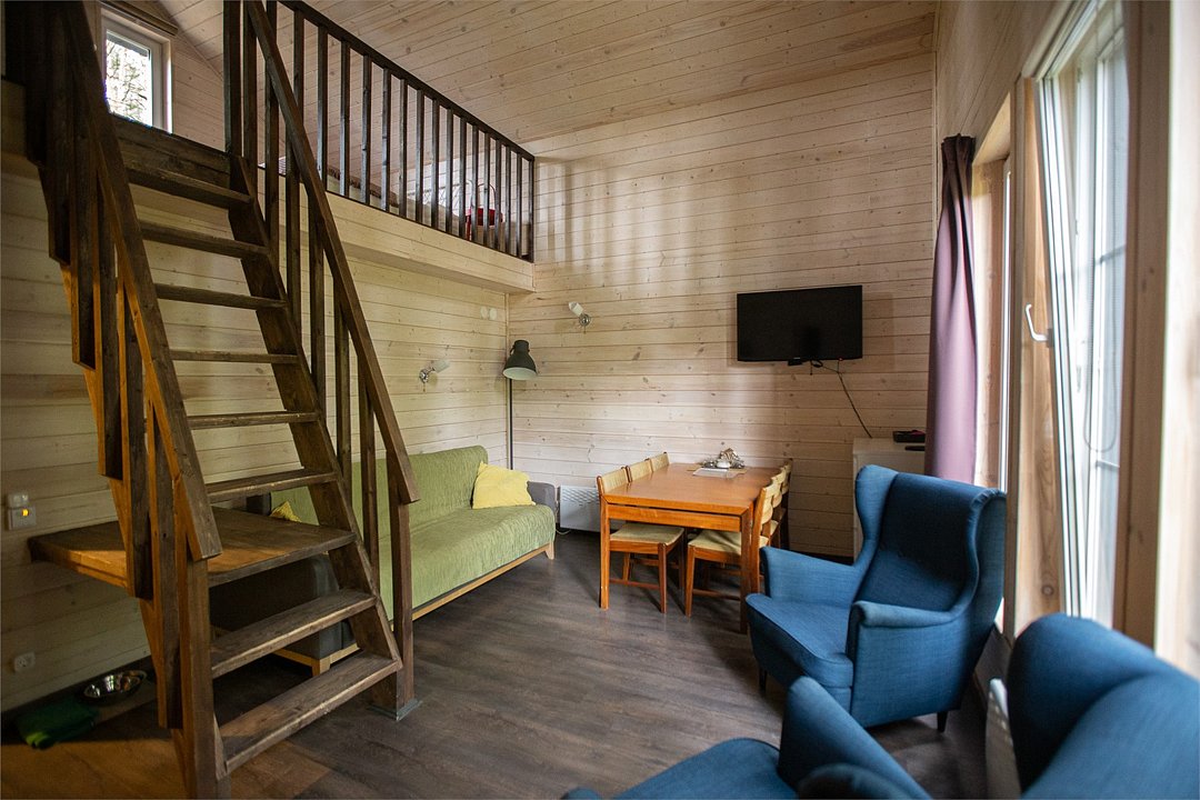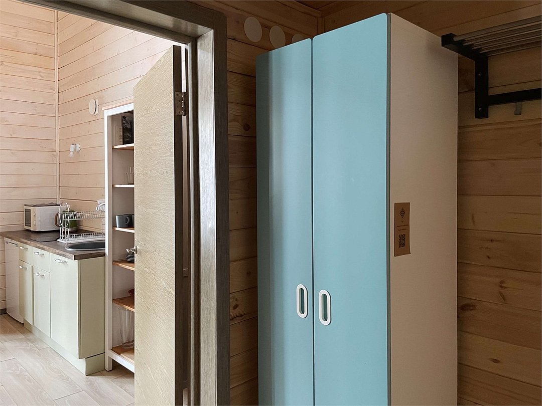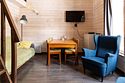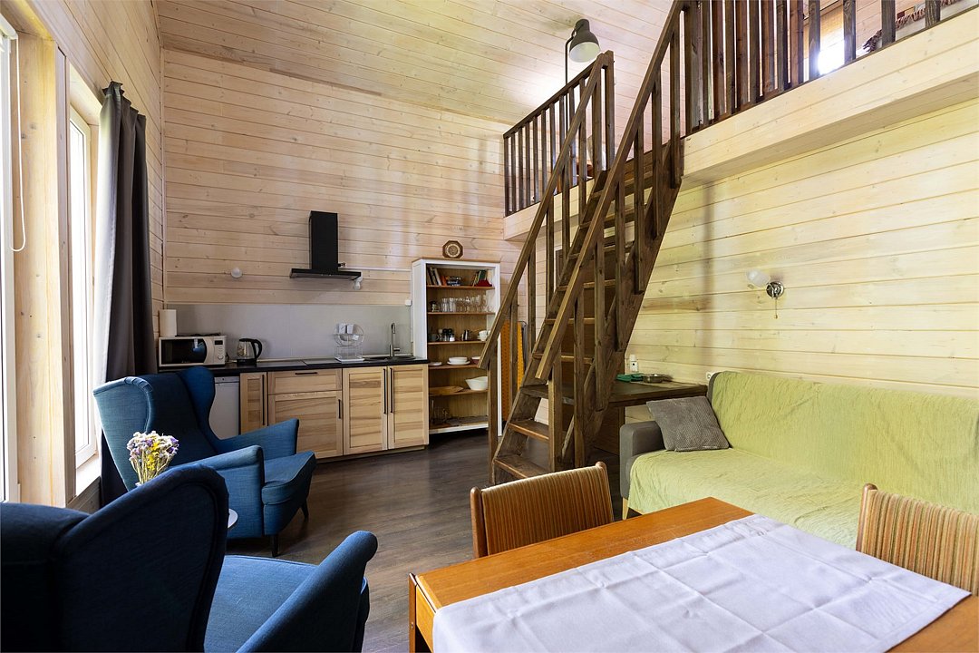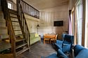 ■ одна из двух комнат в одном домике ■ кухонный уголок: мини-холодильник, микроволновка, электрический чайник, посуда и приборы ■ двуспальная кровать + спальное место на антресоли ■ ванная комната с душевой кабиной ■ до 4 гостей В одном домике находятся две комнаты с общей прихожей. Одна комната — дабл, другая — с антресолью. В комнате антресолью могут разместиться до 4 человек, она состоит из жилой комнаты и санузла. По всей комнате теплый пол, температуру можно регулировать. Двуспальная кровать с удобным матрасом расположена напротив больших окон в пол с видом на лес. Еще одно спальное место — на антресоли под крышей. ❗Обратите внимание, что лестница, которая ведет на антресоль, довольно крутая и подойдет не всем. Кухонный уголок оснащен мини-холодильником, микроволновкой, электрическим чайником и набором чайной посуды. Есть обеденный стол и четыре стула. Ванная комната с туалетом, душевой кабиной, теплым полом. В ванной есть фен, по два полотенца для каждого гостя, жидкое мыло и гель для душа. Около каждого домика есть площадка с мангалом и столом для пикника (мангал общий, на обе комнаты). ❗У этой комнаты смежная стена с другой комнатой в домике. В деревянных домах слышимость отличается от привычной городской, и это может быть некомфортно для людей с чутким сном. Пожалуйста, будьте внимательны к другим гостям, соблюдайте тихий час после 22:00. Если важна уединенность, лучше выбрать отдельный дом (Брусника, Клюква, Черника, Морошка). Время заезда и выезда: ▸ check-in с 15:00 ▸ check-out до 12:00Услуги и удобства