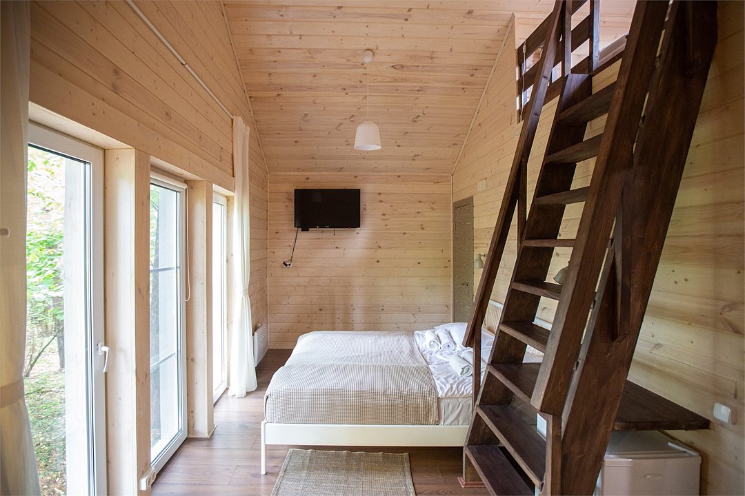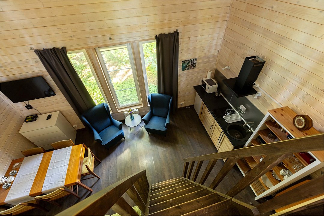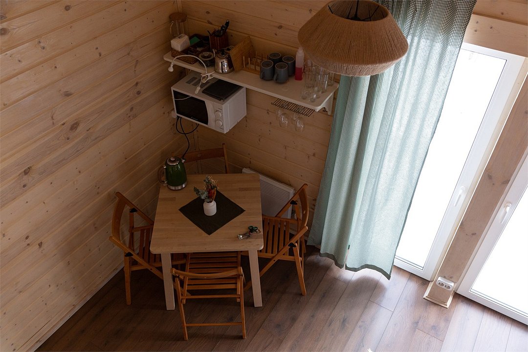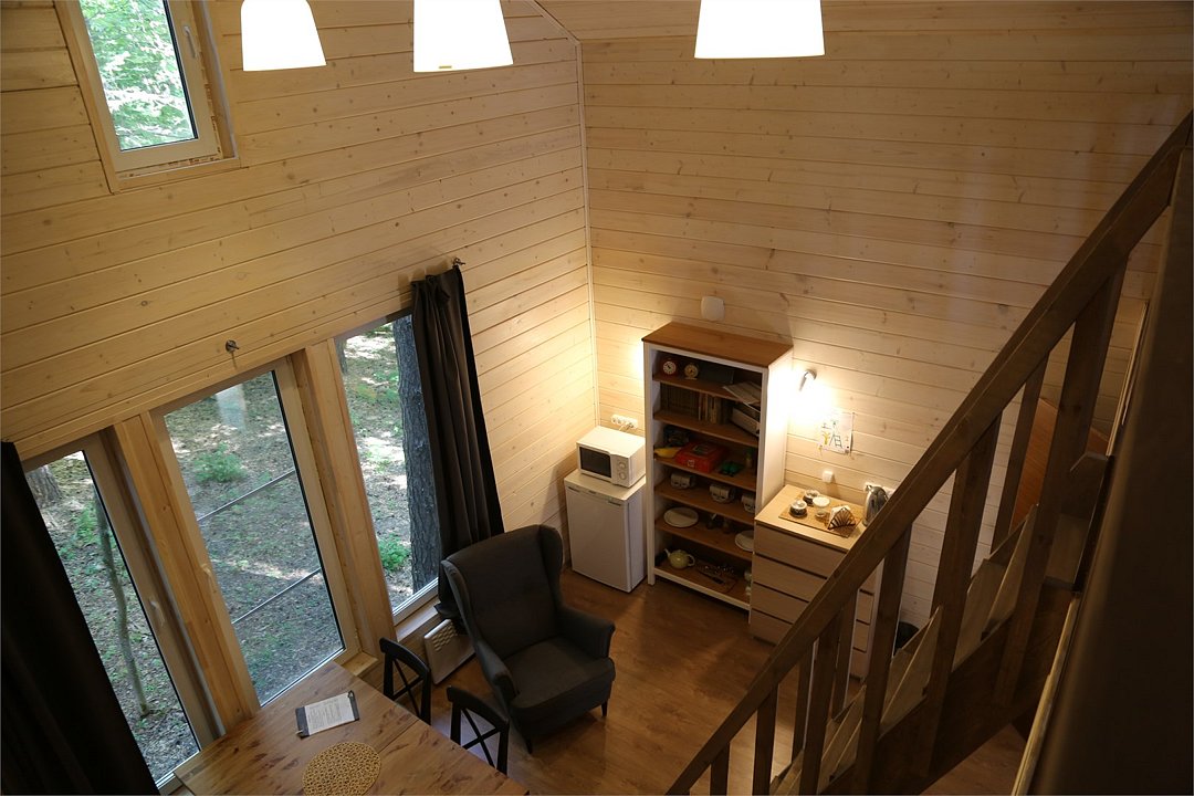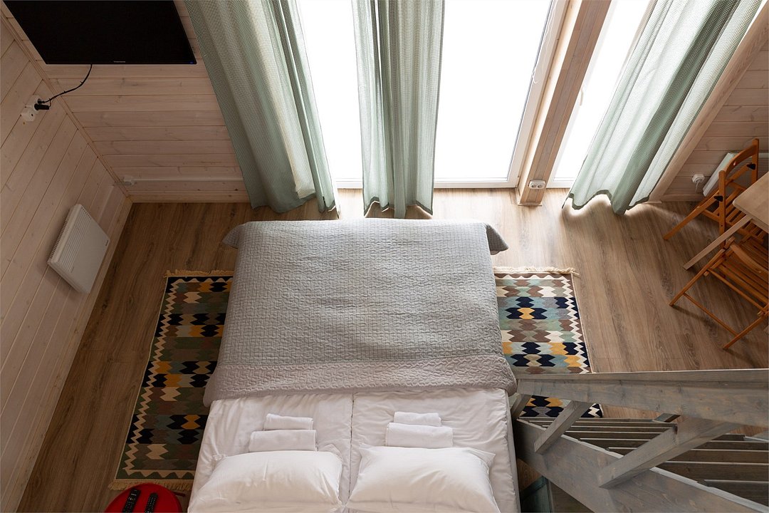 Wi-Fi, фен, микроволновая печь, ванная комната, душевая кабина, теплый пол, банные полотенца, двуспальная кровать, стулья, чайный набор, набор посуды, чайник, унитаз, раковина, стаканы, стол, мангал, панорамные окна, телевизор с плоским экраном, мини-холодильник, кухонный уголок, москитная сетка, мансардные окна, теплые полы, вид на лес, кровать-антресоль, можно с питомцамиВ номере