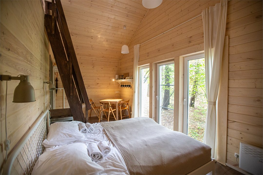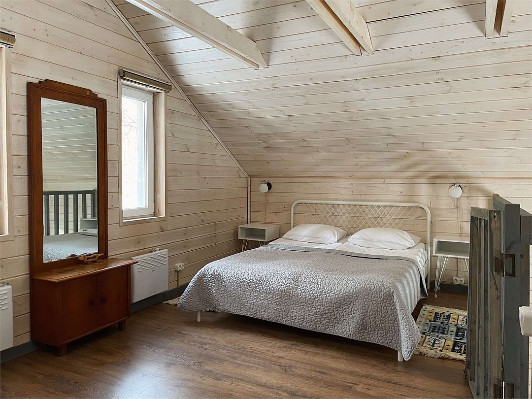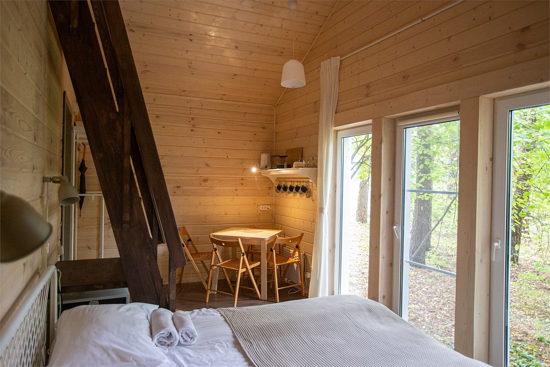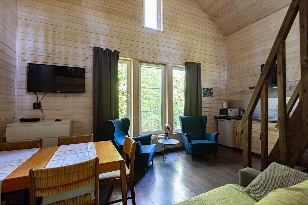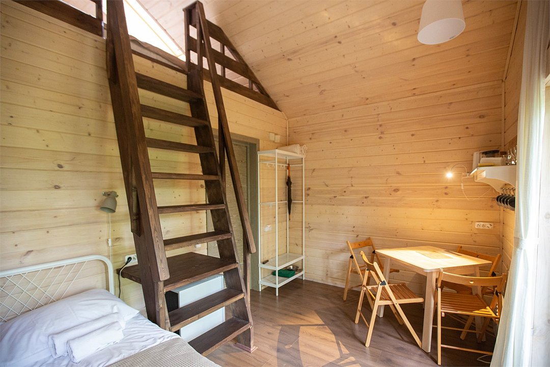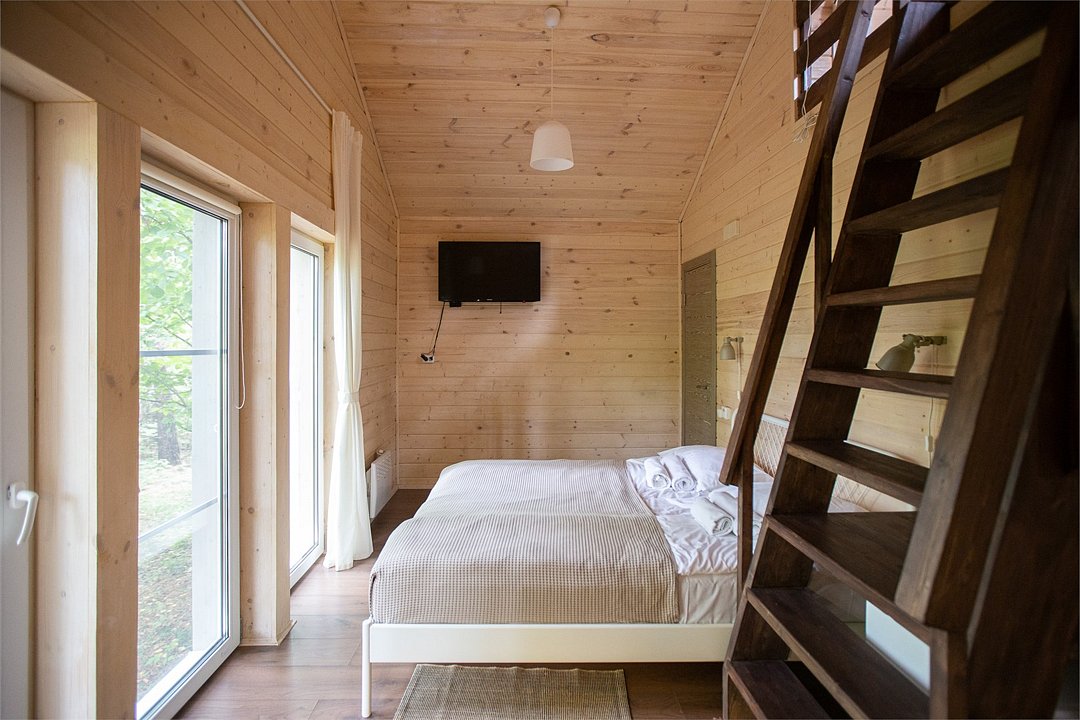 Wi-Fi, фен, микроволновая печь, ванная комната, душевая кабина, теплый пол, банные полотенца, двуспальная кровать, стулья, чайный набор, набор посуды, чайник, унитаз, раковина, стаканы, стол, мангал, панорамные окна, телевизор с плоским экраном, мини-холодильник, кухонный уголок, москитная сетка, мансардные окна, теплые полы, вид на лес, кровать-антресоль, можно с питомцамиВ номере