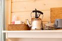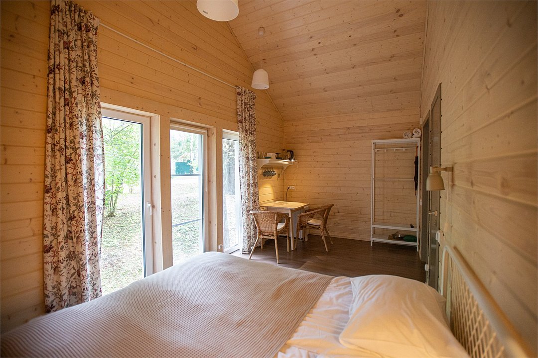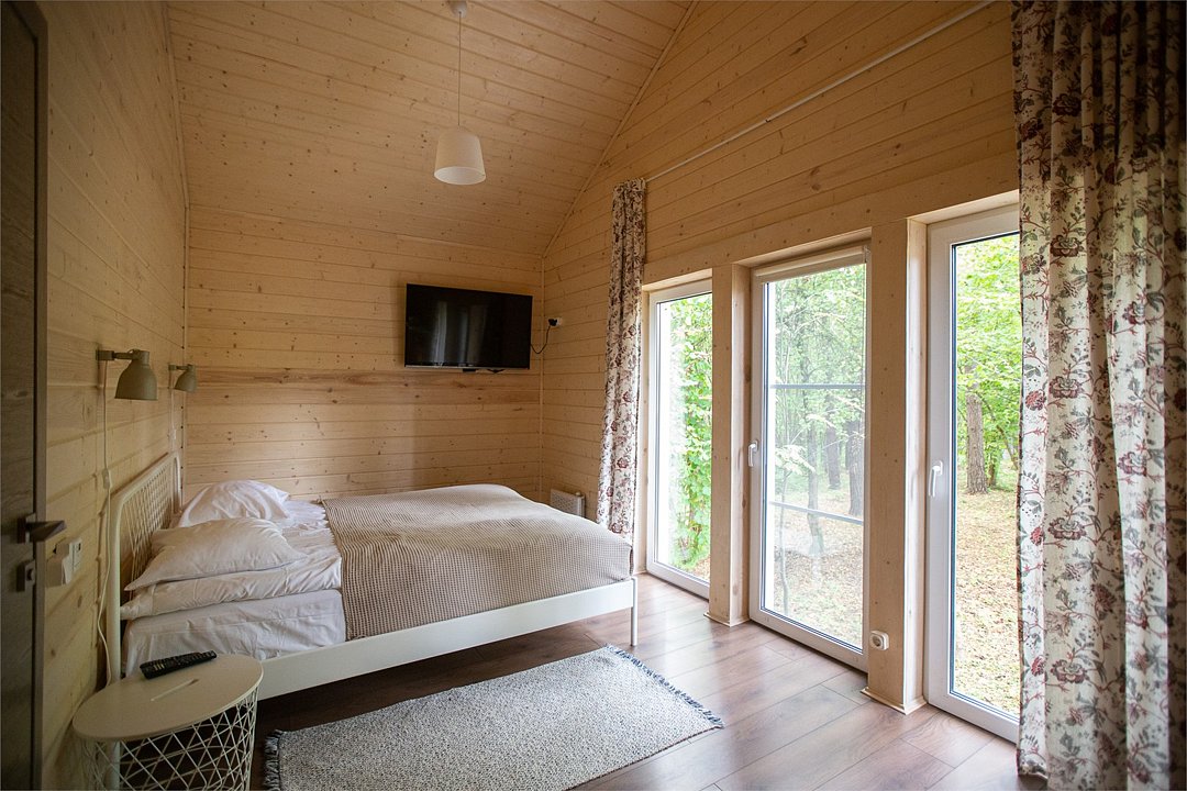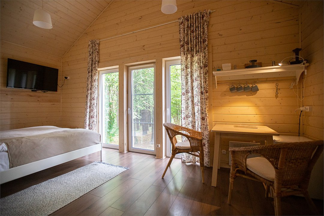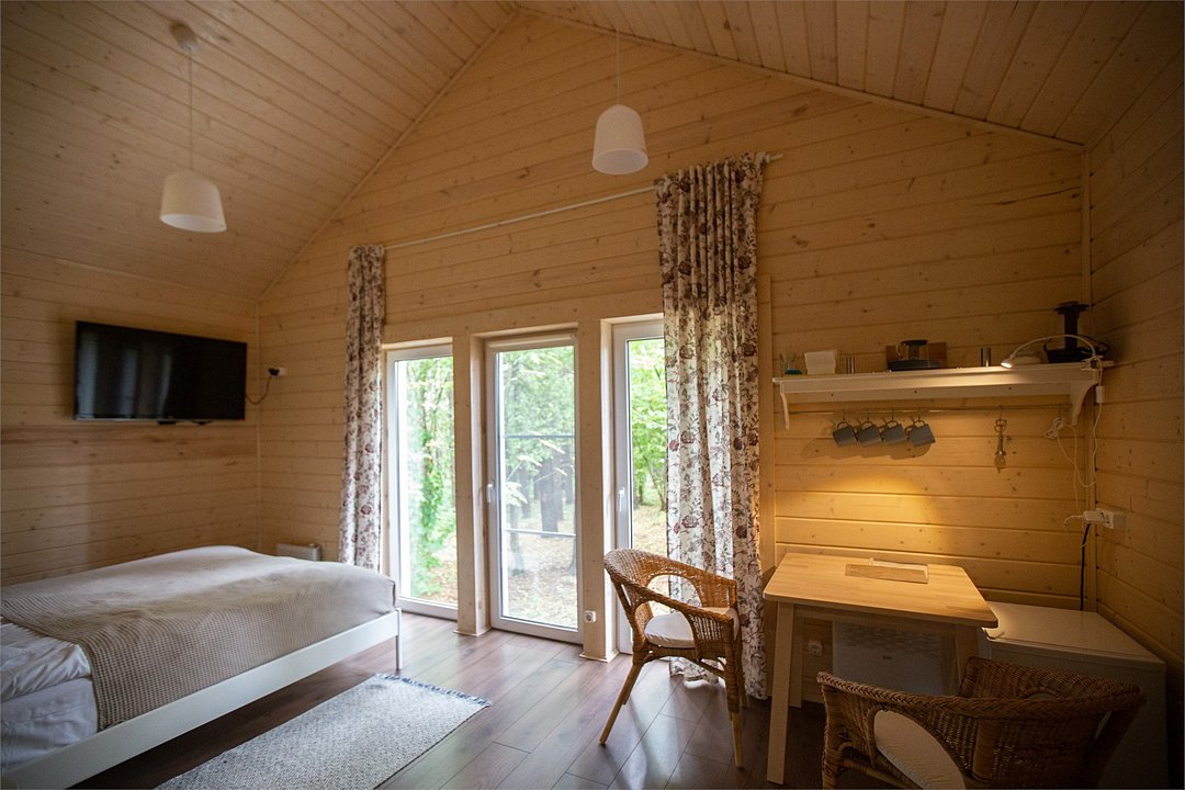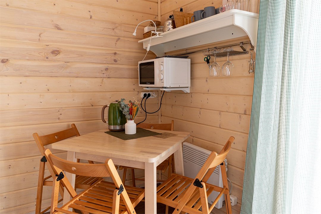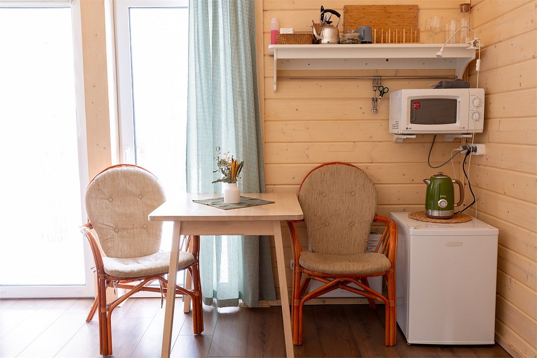 Wi-Fi, фен, микроволновая печь, ванная комната, душевая кабина, теплый пол, банные полотенца, двуспальная кровать, стулья, чайный набор, набор посуды, чайник, унитаз, раковина, стаканы, стол, мангал, панорамные окна, телевизор с плоским экраном, мини-холодильник, кухонный уголок, москитная сетка, теплые полы, вид на лес, можно с питомцамиВ номере