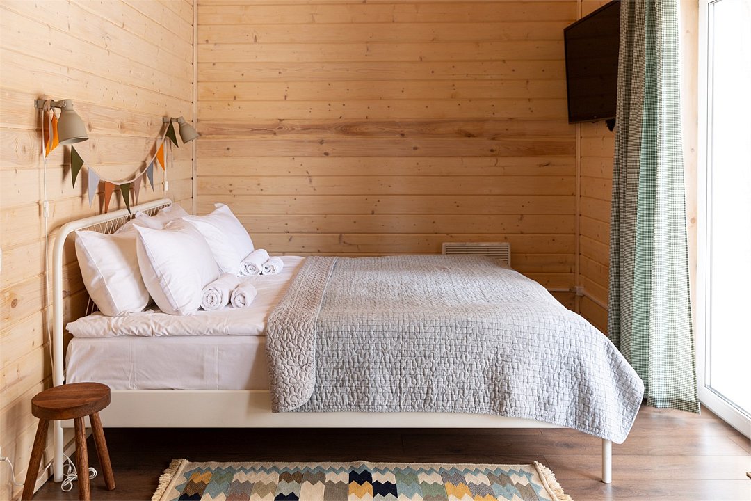 ■ одна из двух комнат в одном домике ■ кухонный уголок: мини-холодильник, микроволновка, электрический чайник, посуда и приборы ■ двуспальная кровать ■ ванная комната с душевой кабиной ■ до 2 гостей В одном домике находятся две комнаты с общей прихожей. Одна комната — дабл, другая — с антресолью. В комнате дабл могут разместиться до 2 человек, она состоит из жилой комнаты и санузла. По всей комнате теплый пол, температуру можно регулировать. Двуспальная кровать с удобным матрасом расположена напротив больших окон в пол с видом на лес. Кухонный уголок оснащен мини-холодильником, микроволновкой, электрическим чайником и набором чайной посуды. Есть обеденный стол и два стула. Ванная комната с туалетом, душевой кабиной, теплым полом. В ванной есть фен, по два полотенца для каждого гостя, жидкое мыло и гель для душа. Около каждого домика есть площадка с мангалом и столом для пикника (мангал общий, на обе комнаты). ❗У этой комнаты смежная стена с другой комнатой в домике. Слышимость здесь отличается от привычной городской, и это может быть некомфортно для людей с чутким сном. Пожалуйста, будьте внимательны к другим гостям, соблюдайте тихий час после 22:00. Если важна уединенность, лучше выбрать отдельный дом (Брусника, Клюква, Черника, Морошка). Время заезда и выезда: ▸ check-in с 15:00 ▸ check-out до 12:00Услуги и удобства