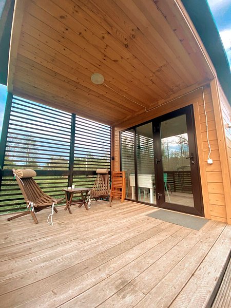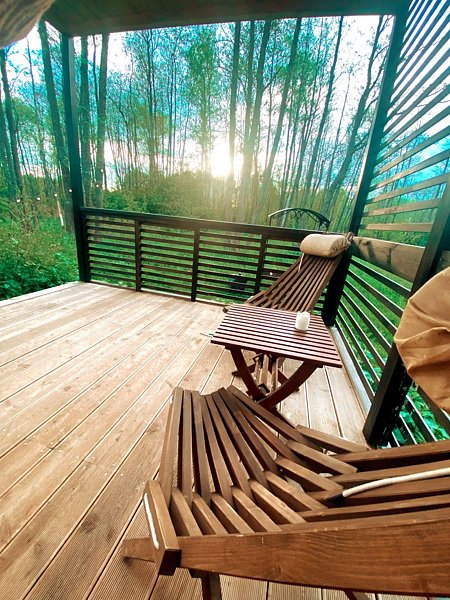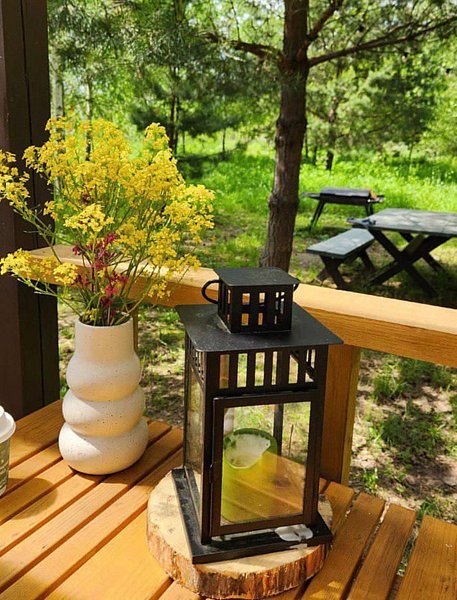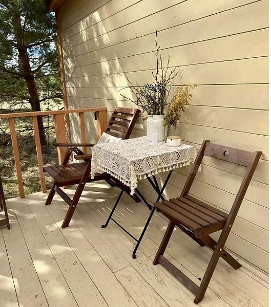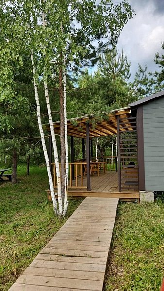 На территории есть уютная зона для отдыха на свежем воздухе. Гости могут расположиться на мягкой комфортной софе в уютном пледе и насладиться ароматным кофе или чаем, любуясь красивым пейзажем вокруг.