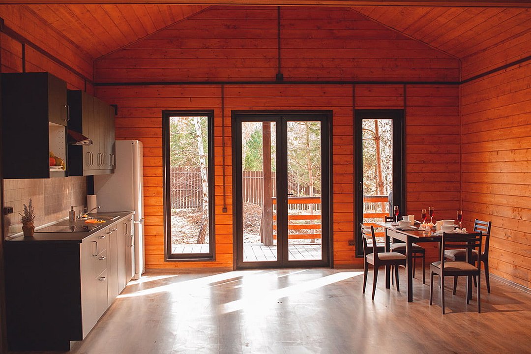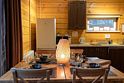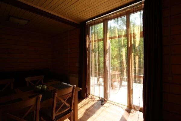 Для удобства в каждой спальне отдельная ванная комната. Гостиная объединена с кухонной зоной, оборудованной всем необходимым: микроволновая печь, холодильник, электрический чайник, плита и даже посудомоечная машина. В гостиной удобный диван с большим телевизором напротив. Большой обеденный стол, а также панорамные окна с выходом на просторную террасу, где можно расположиться всей компанией. Во всех домах высокоскоростной интернет и спутниковое телевидение. Возле каждого коттеджа своя мангальная зона, где можно в любое время приготовить еду на углях.
