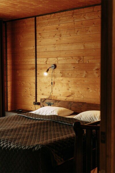 В просторном доме, площадью 54 кв. м, есть все необходимое для комфортного проживания. Кухня укомплектована необходимой техникой и посудой. На первом этаже расположена гостиная зона с двуспальным диваном, а из панорамных окон открывается вид на лес. На втором этаже открытая двуспальная кровать (размер “King size”) .Рядом с домом расположена мангальная зона с барбекю (решетку и шампура предоставляем).