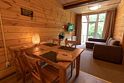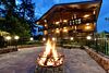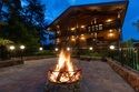 На первом этаже располагается полноценная кухня, переходящая в обеденную зону с большим столом и зону гостиной с диванами и плоским телевизором, откуда можно переместиться на террасу с костровой чашей и потрясающим видом на лес.
