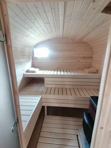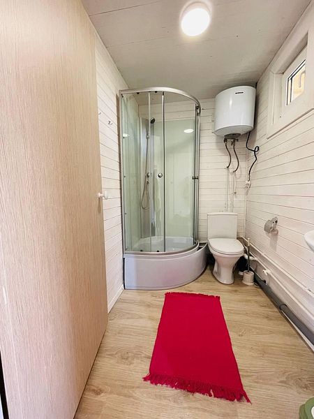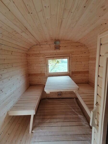 В предбаннике полноразмерный стол с самоваром и лавочки на 4-6 человек, большое окно.