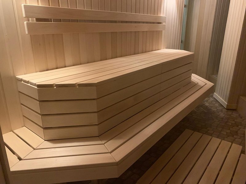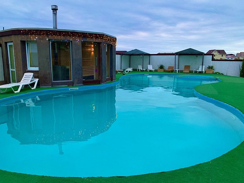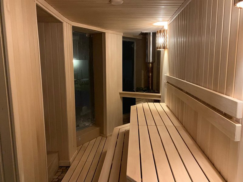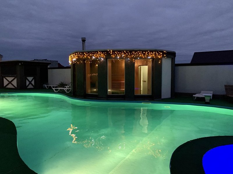 Сауна с большим открытым бассейном (20 м) и парилка с панорамными окнами и дверью, с возможностью прыгать прямо из парилки в бассейн. Кроме этого, выйдя из парилки можно сразу облиться из кадушки.