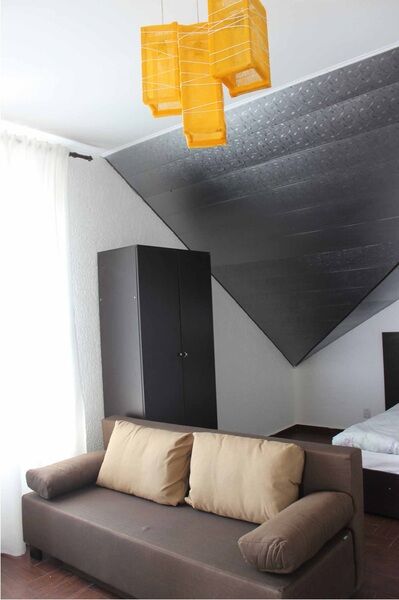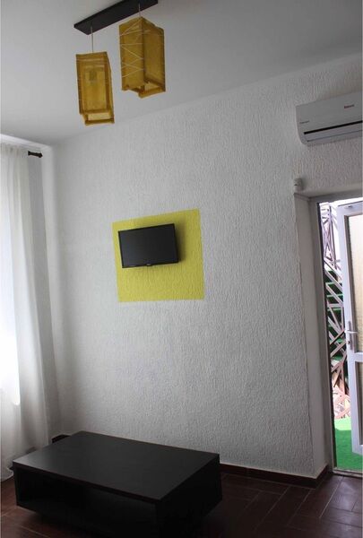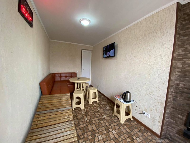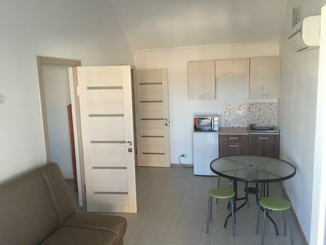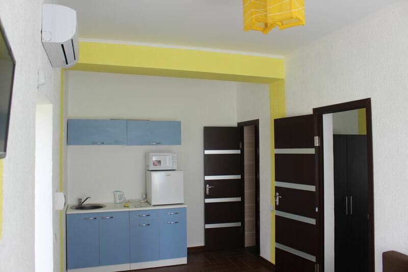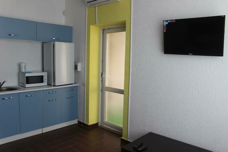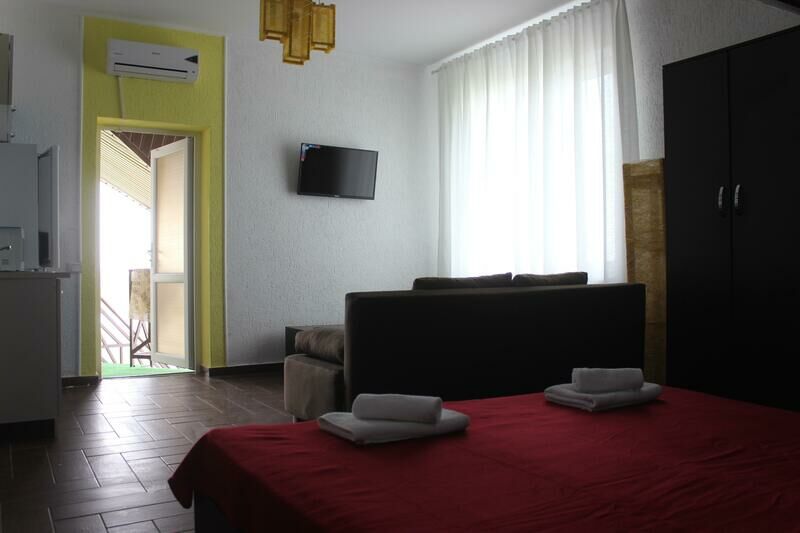 Номер «Студио» — это одна большая комната, расположенная на третьем этаже. В номере есть мини-кухня, двухспальная кровать, раскладной диван (2 спальных места), кондиционер, ЖК-телевизор, журнальный столик, платяной шкаф, холодильник, эл. чайник, микроволновая печь, интернет Wi-Fi.