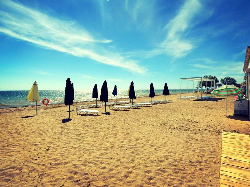Тип пляжа: песчаныйДо ближайшего пляжа «Мохито» 900 м. Можно дойти пешком (10–15 минут), доехать на авто или велосипеде. Пляж песочный, оборудован защитой от солнца. Есть туалет, душ, аренда шезлонгов. Заход в море плавный и безопасный для детей. На берегу для всех работает кафе «Мохито». Есть также и другие пляжи в общественном доступе.