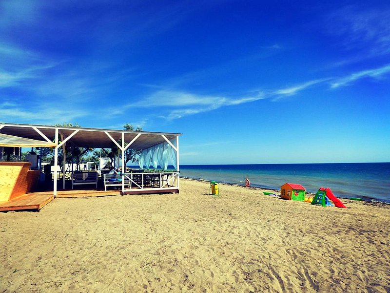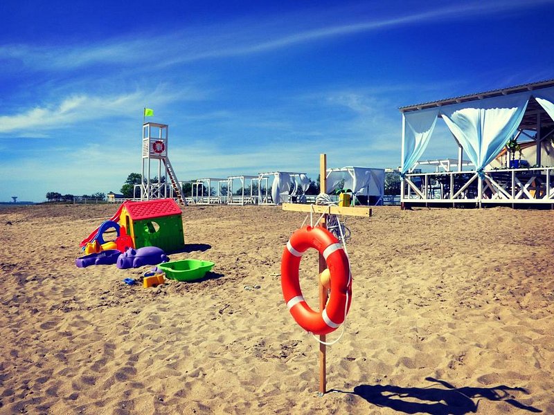 До ближайшего пляжа «Мохито» 900 м. Можно дойти пешком (10–15 минут), доехать на авто или велосипеде. Пляж песочный, оборудован защитой от солнца. Есть туалет, душ, аренда шезлонгов. Заход в море плавный и безопасный для детей. На берегу для всех работает кафе «Мохито». Есть также и другие пляжи в общественном доступе.
