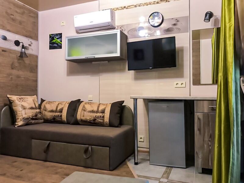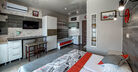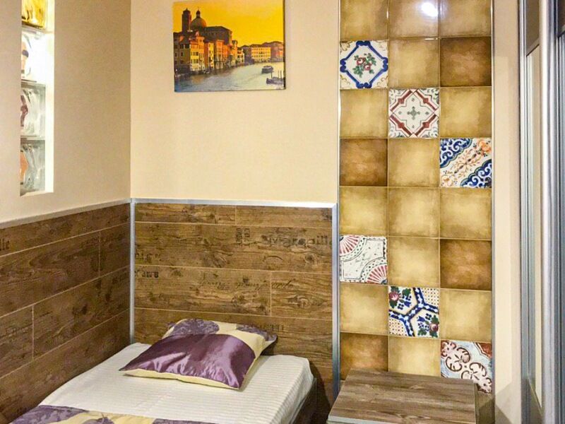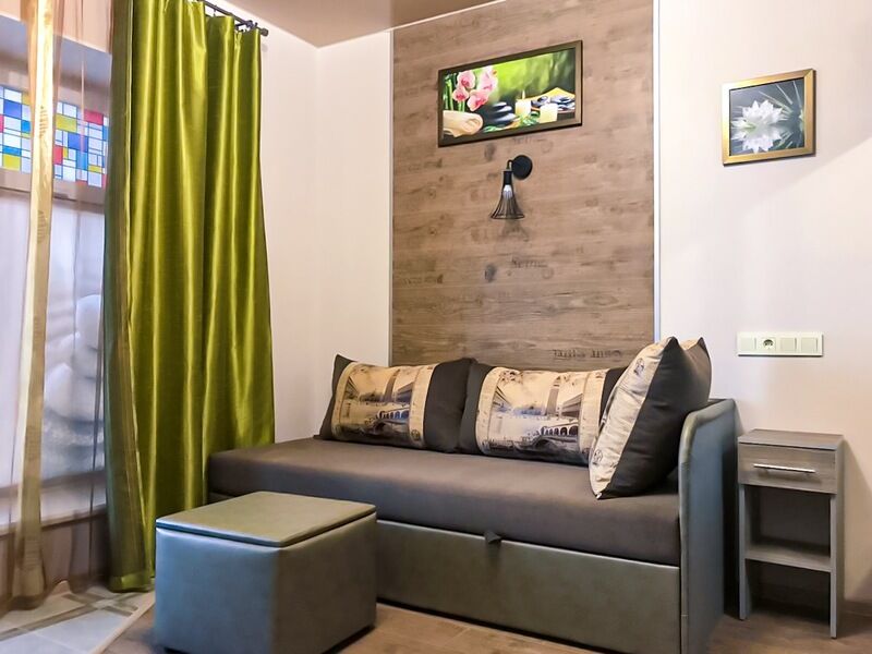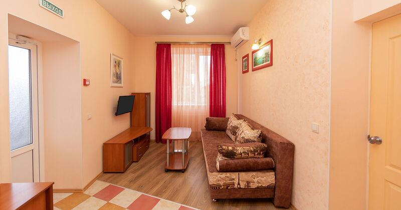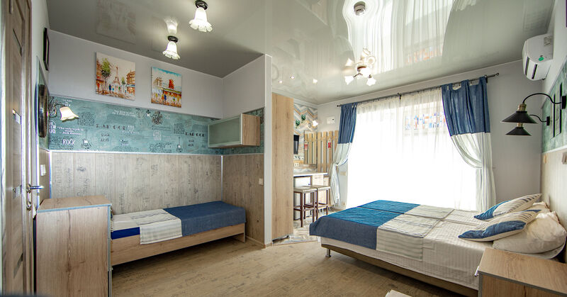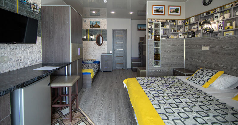 В номере спальные места: 1) односпальный диван-кровать и раскладной двуспальный диван-кровать, 2) двуспальная кровать и дополнительное место - второй ярус над изголовьем кровати. ВНИМАНИЕ! Вид из окна в общий коридор.