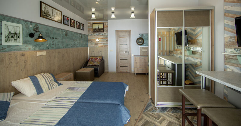 В номере спальные места: двуспальная кровать, односпальная кровать, кресло-кровать или кровать над шкафом