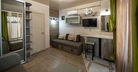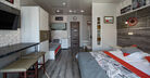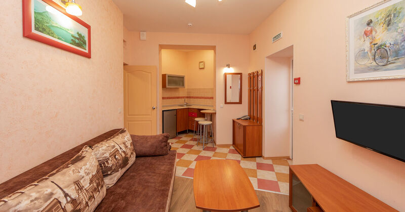 В номере спальные места: двуспальная кровать и раскладной двуспальный диван. ВНИМАНИЕ! Два дополнительных места размещаются на одном двуспальном раскладном диване. Отдельные спальные места не предоставляются. Все номера данной категории расположены на третьих этажах.
