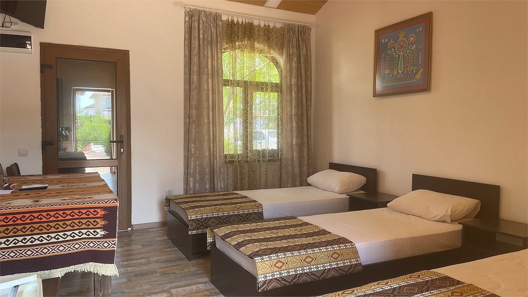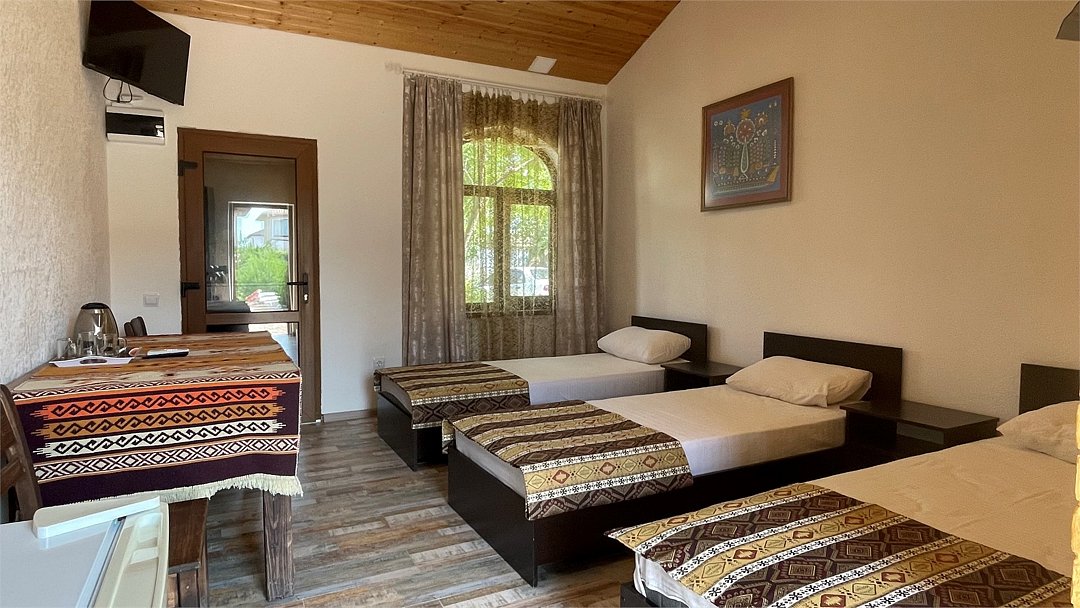 телевизор, Wi-Fi, холодильник, фен, стулья, шкаф для одежды, зеркало, чайник, унитаз, отдельный вход в номер, душ, три односпальные кровати, вид во двор, стол, тумба, туалет, сушилка для белья, мыло, открытый шкаф, без питомцевВ номере