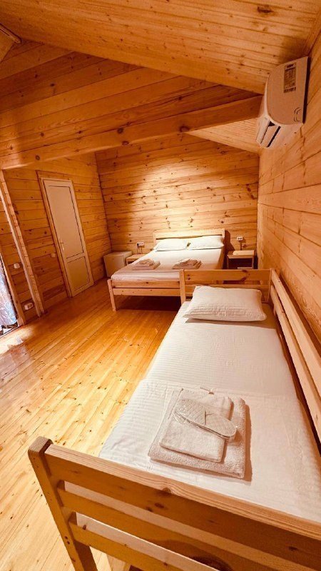 Дом категории «Стандарт» Натуральные материалы. Тёплая атмосфера. Личное пространство. Интерьер дома полностью выполнен из натурального дерева. Живые текстуры, тёплый оттенок стен и мягкий свет создают ощущение уюта и спокойствия уже с первых минут. Это не просто номер — это отдельное пространство, где легко дышится и комфортно отдыхать. Спальные места • Просторная двуспальная кровать • Односпальная кровать • Возможность дополнительного размещения Белоснежное постельное бельё подчёркивает чистоту и аккуратность интерьера, а плотные портьеры и лёгкая тюль позволяют создать приватную атмосферу в любое время суток. Зона отдыха и хранения • Обеденный стол внутри дома • Стол на террасе для завтраков на свежем воздухе • 4 стула • Шкаф для одежды • 2 прикроватные тумбочки • Сейф для хранения ценных вещей • Бельевой ящик Каждая деталь продумана для удобства проживания не на несколько дней, а для долгого полноценного отпуска. Техника и комфорт • Телевизор со Smart TV • Wi-Fi • Кондиционер • Мини-холодильник Вы можете отдыхать в тишине или провести вечер за любимым фильмом — всё зависит от вашего настроения. Отдельный санузел Каждый дом оборудован собственным санузлом: • Душевая кабина 90×90 • Бойлер 80 литров • Унитаз • Раковина с тумбой • Полочки для удобного размещения личных вещей Гостям предоставляются белые полотенца и всё необходимое для комфортного проживания. Терраса Отдельная терраса со столом — место, где приятно начинать утро с чашки кофе или проводить спокойные летние вечера.Услуги и удобства