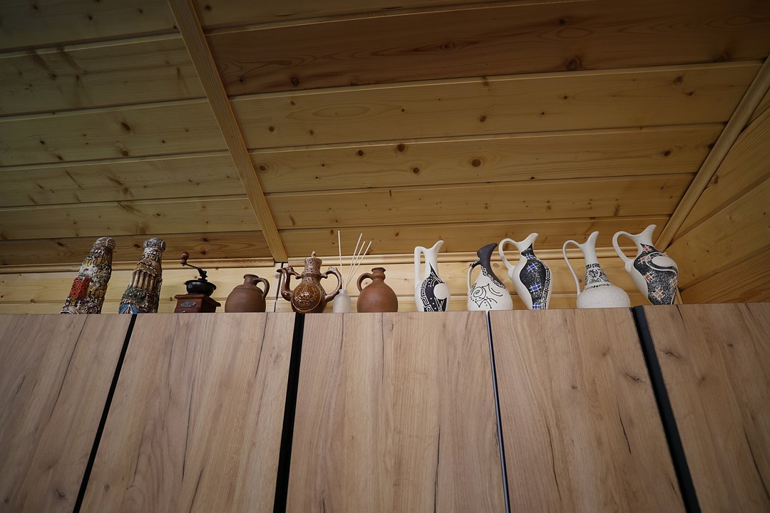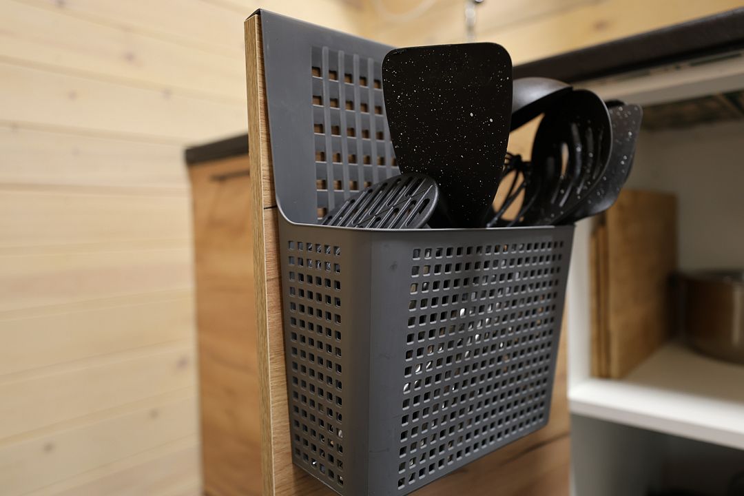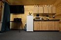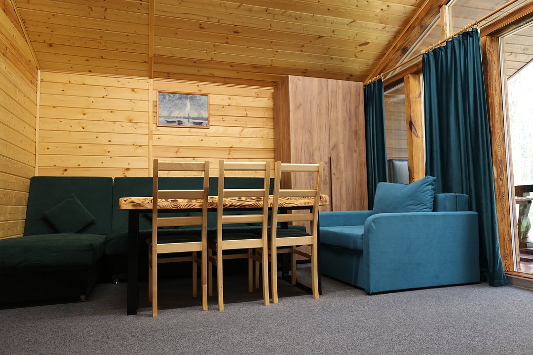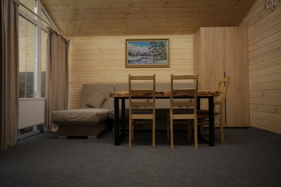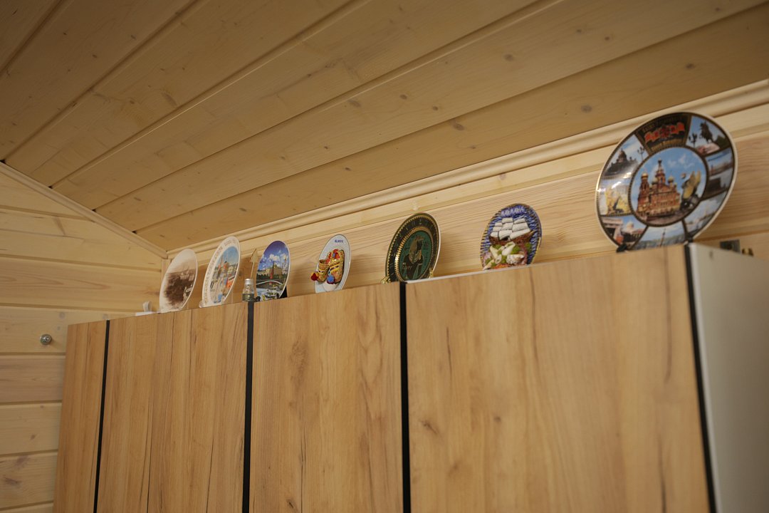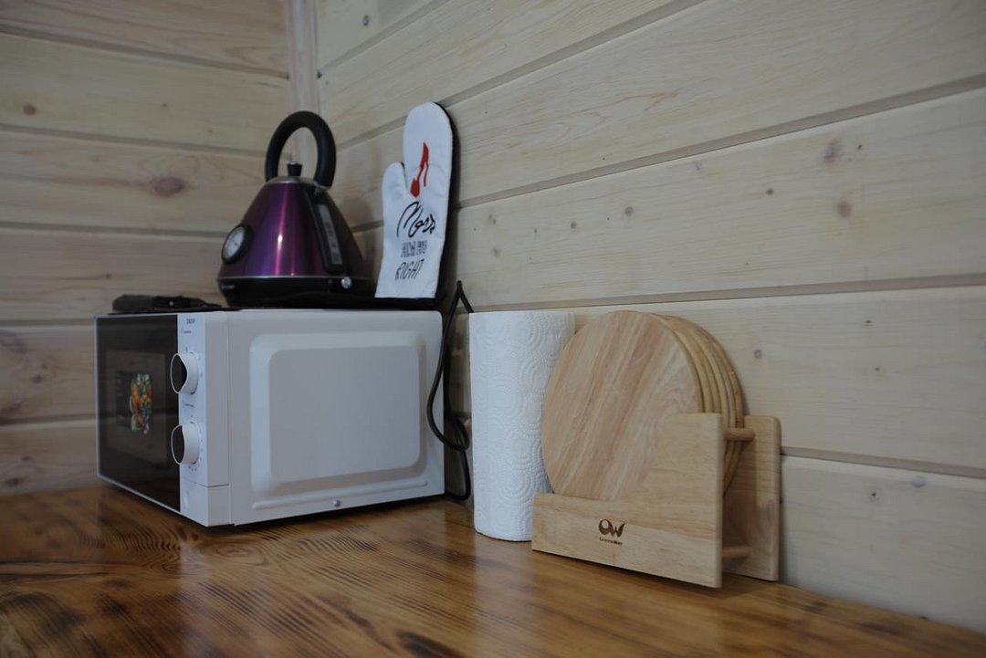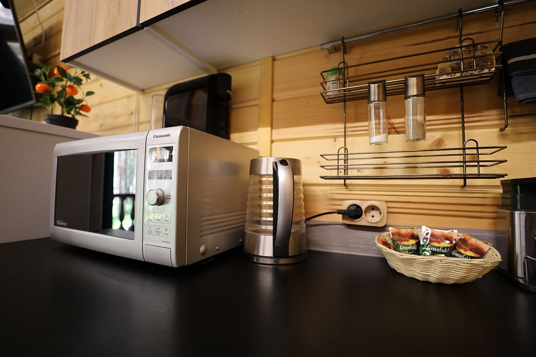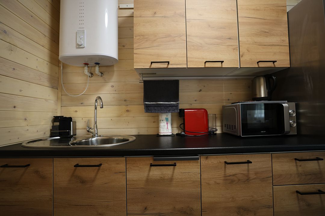 Кухонная зона включает варочную поверхность, холодильник, микроволновую печь и полный комплект посуды. За обеденным столом могут разместиться до шести человек, что делает домик удобным как для семейных посиделок, так и для дружеских вечеров.