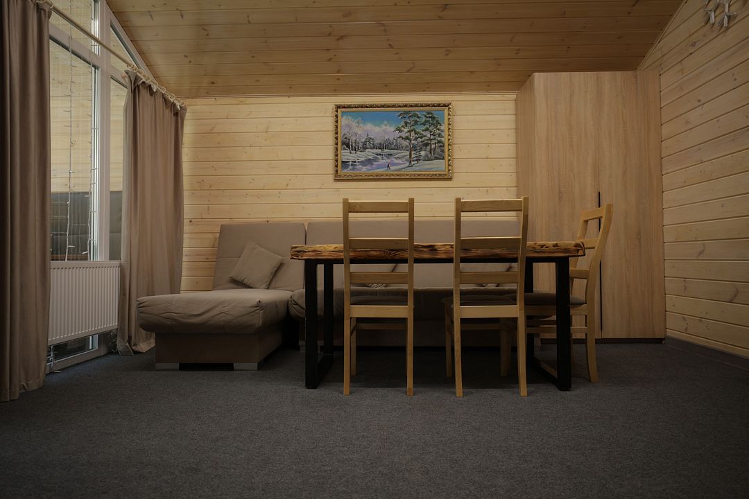 Чудесный дом №5 «Amour House» оборудован всем необходимым для комфортного проживания. В вашем распоряжении прихожая, санузел с душевой комнатой, тёплый пол в душевой, банные полотенца, фен и все необходимые средства личной гигиены. Кухня оснащена современной техникой: варочная поверхность, холодильник, микроволновая печь и полный комплект посуды. За большим обеденным столом может с комфортом разместиться до десяти человек — идеально для дружеских вечеров и семейных ужинов. В доме есть Smart-TV и Wi-Fi, чтобы вы всегда могли оставаться на связи и наслаждаться любимыми фильмами или музыкой.