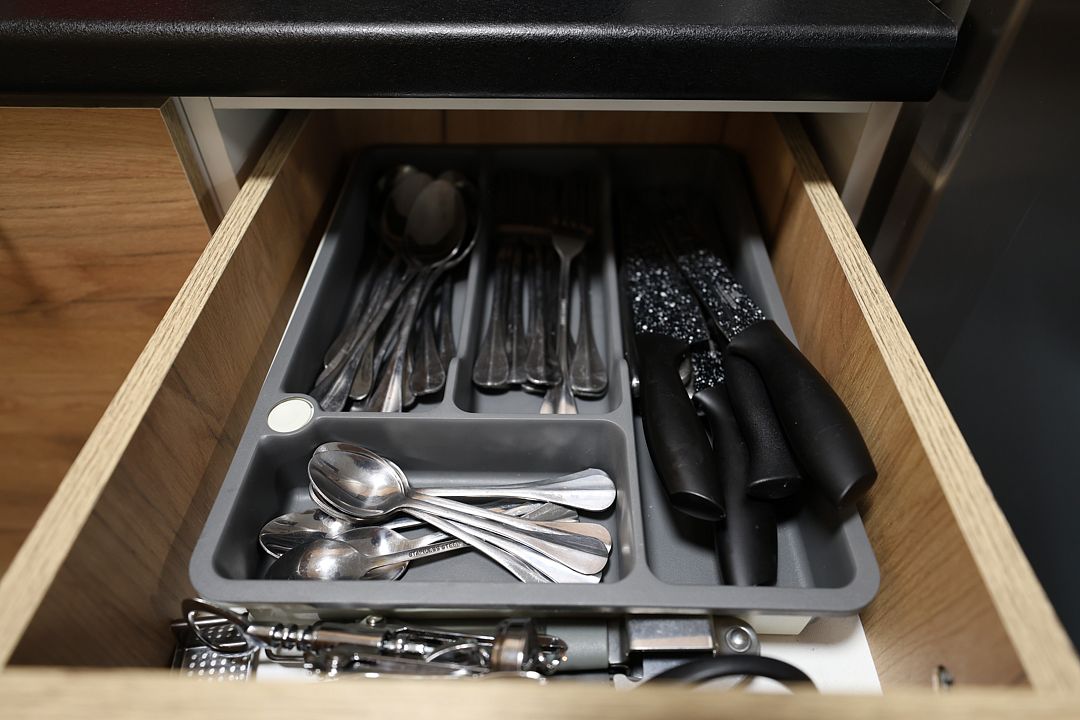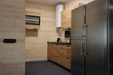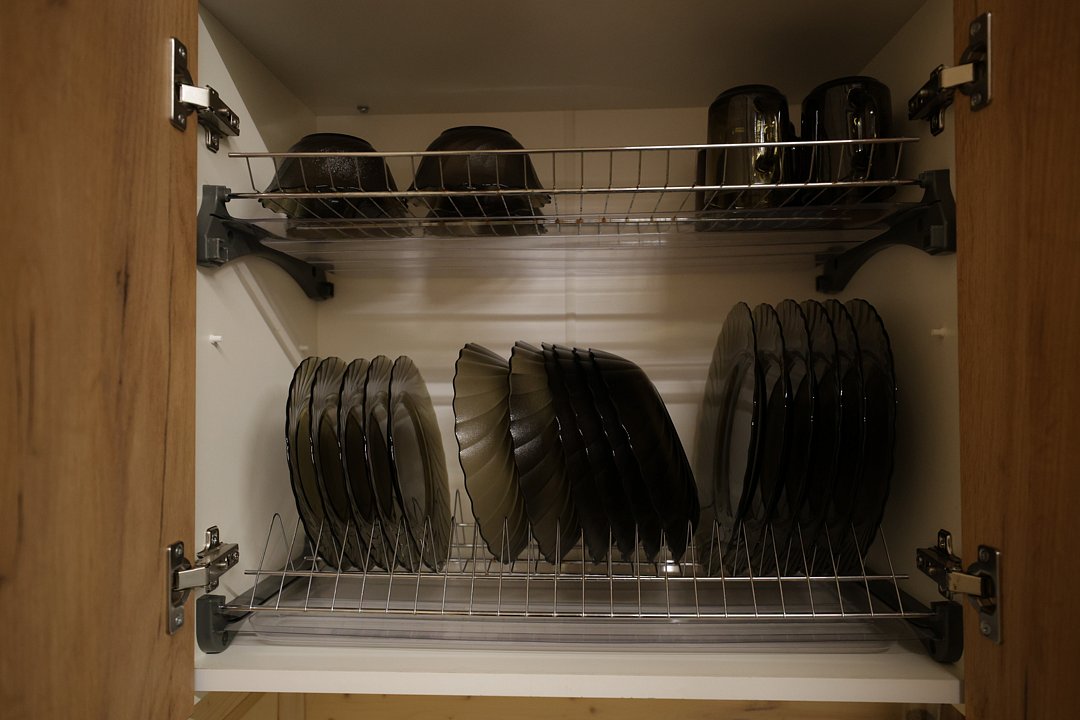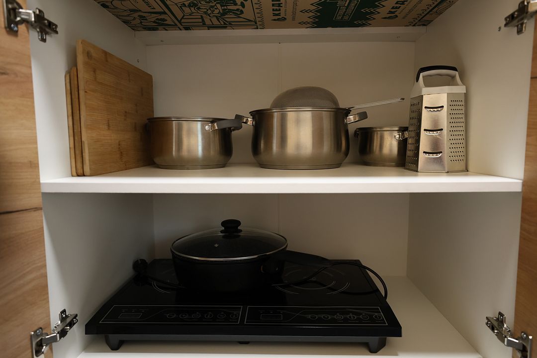 Кухня укомплектована варочной поверхностью, холодильником, микроволновой печью и необходимой посудой. Обеденная зона рассчитана на пять человек — уютное место для завтраков, обедов и неспешных ужинов.