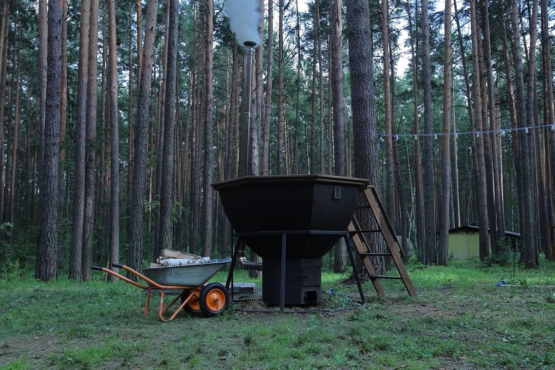 Банный чан посреди соснового бора.