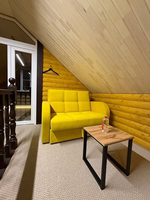 Домик прекрасно подойдёт и для большой компании до 10 человек. Обширная гостиная для тёплых посиделок в кругу семьи и друзей, уютный второй этаж для влюблённой пары и все необходимые удобства сделают отдых максимально комфортным. Основных спальных мест — 8, в качестве дополнительных предлагаются комфортные раскладные односпальные кровати, которые с лёгкостью установим в просторной гостиной. Количество дополнительных спальных мест — 2.