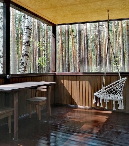 В домике: спальные места. На веранде: стол, скамейки, подвесное кресло-качель.