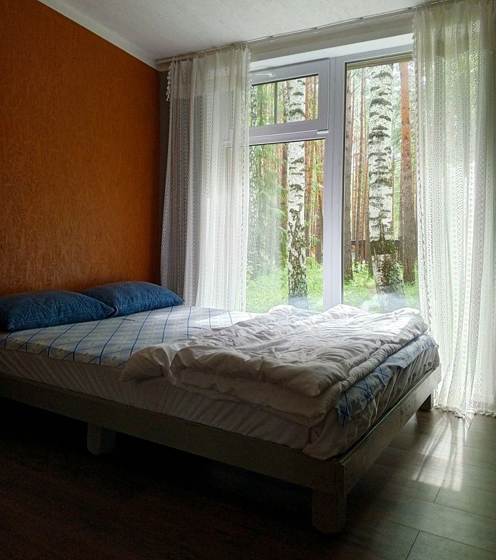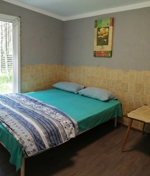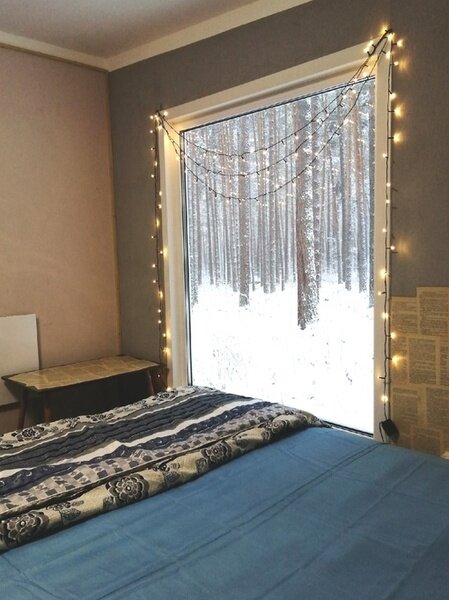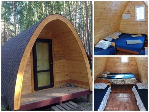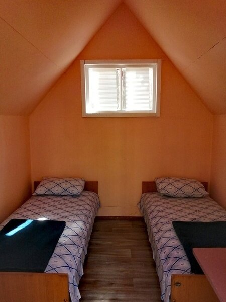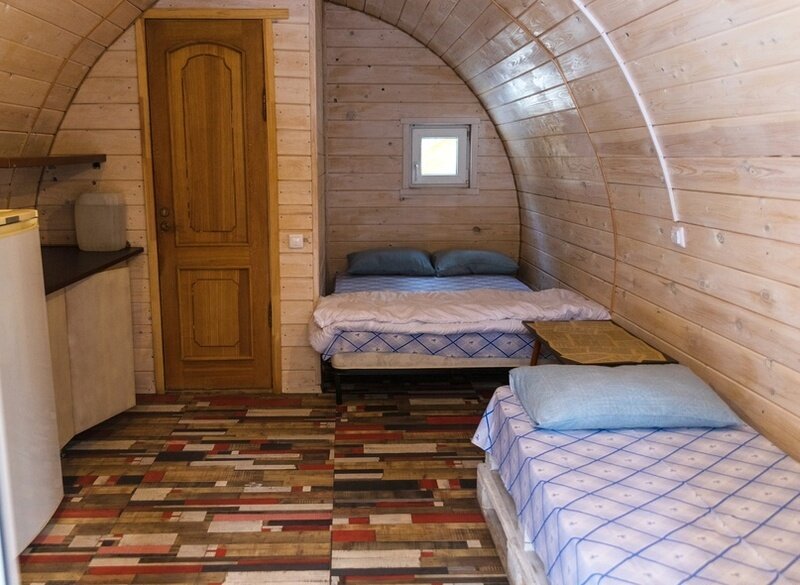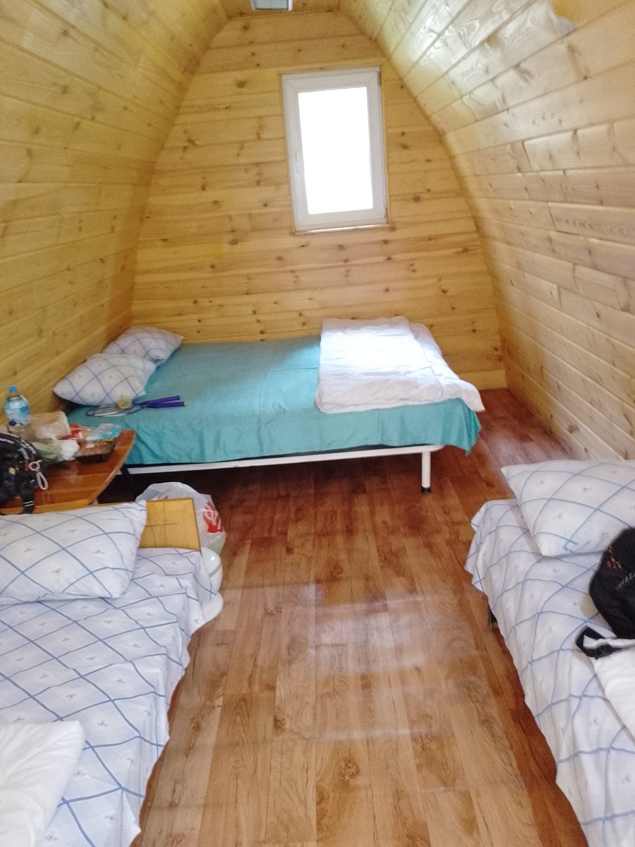 В домике: спальные места (одна 2-спальная и две 1-спальные кровати, постельное белье), столик, чайник, обогреватели, панорамное окно.