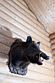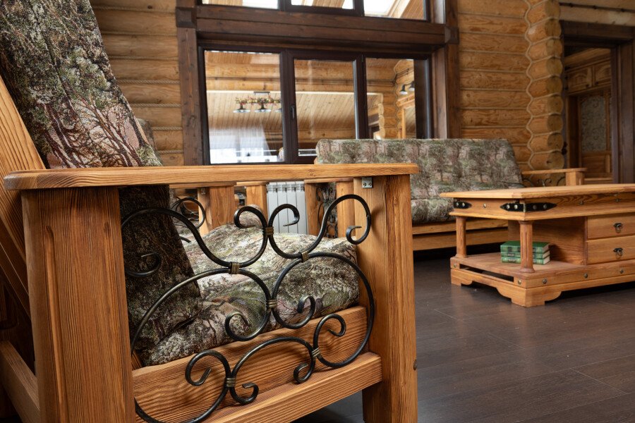 Интерьер дома оформлен в деревенском стиле с массивной мебелью и головой кабана на стене, добавляющей атмосферности в гостиной.