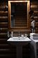 Уунитаз, раковина, душевая кабина, большое зеркало, фен, косметическое зеркало, полотенцесушитель, сушилка для белья.