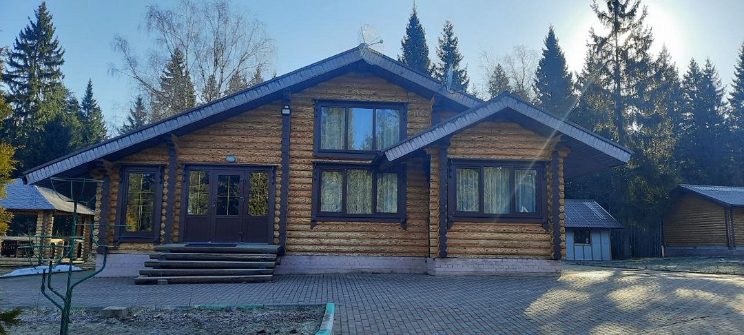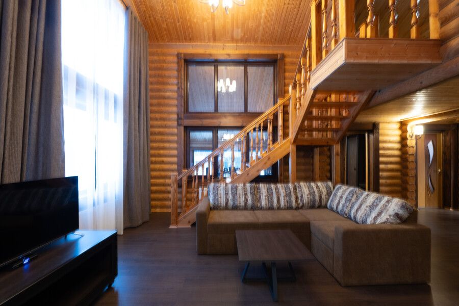 Бревенчатый коттедж с панорамными окнами, высоким потолком и прекрасным видом на озеро и лес идеально подойдет для семей с детьми или компании друзей до 9 человек.