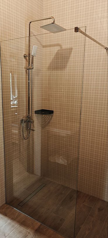 Большая кровать 160х200см, 2-х местный диван, журнальный столик, кухонная зона с посудой, санузел с душевой, прихожая.