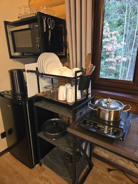 Кухонная зона: кухонный гарнитур, плита индукционная 2-х конфорочная, чайник, тостер, холодильник, микроволновая печь, капсульная кофемашина, большой обеденный стол 90*180 см и стулья. Посуда для приготовления: кастрюли 3 шт, сковорода, комплект кухонных принадлежностей для готовки (лопатка 2 шт, половник, набор ножей 3 шт, разделочная доска 2 шт).