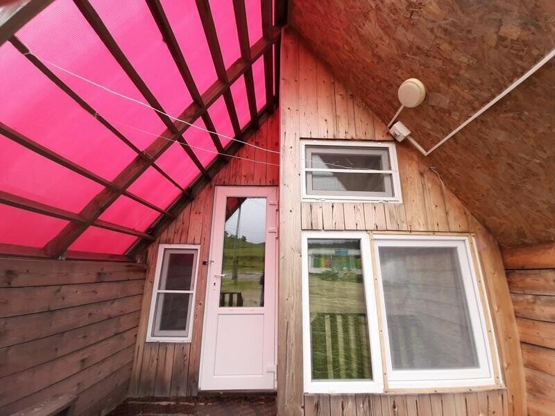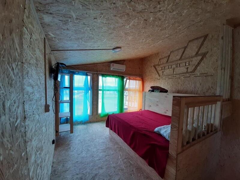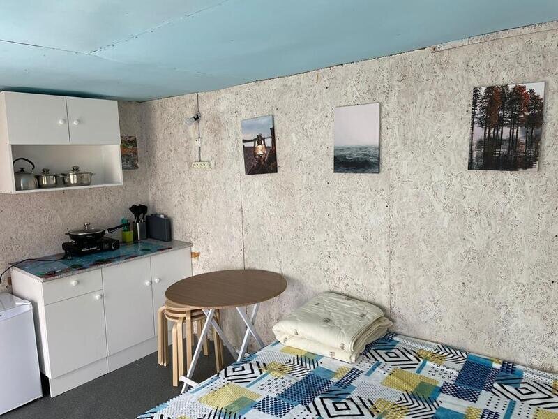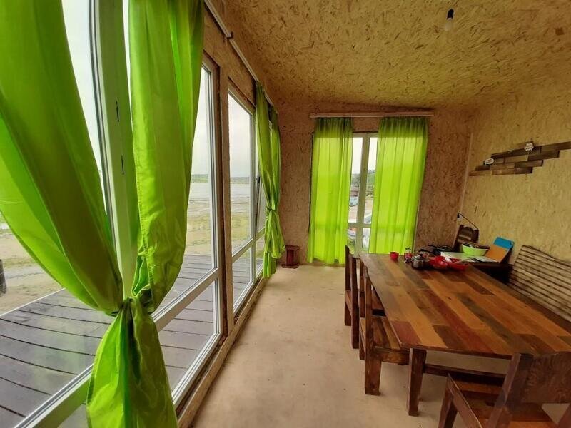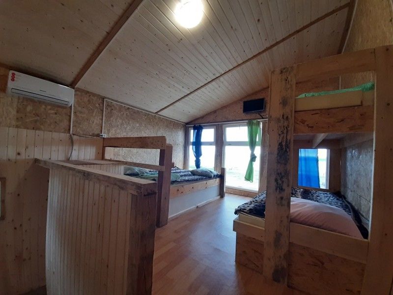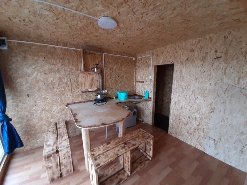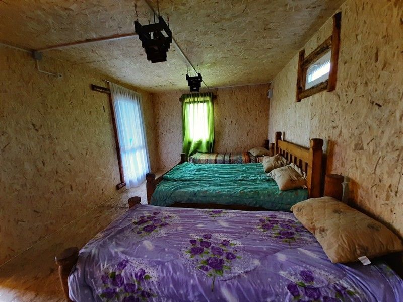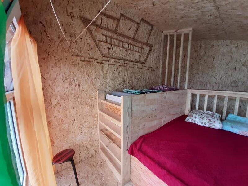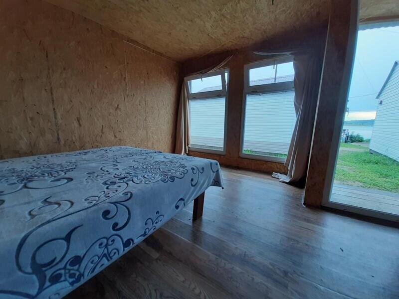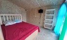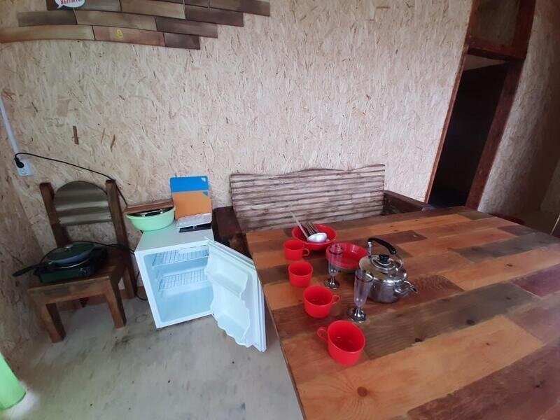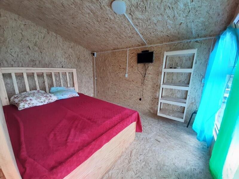 Комплектация - двуспальная и двухъярусная кровати, матрасы, одеяла, подушки, стулья, стол, розетки, холодильник, набор посуды на 4 человека, веник, совок. Душ и туалет в домике. Каждый дом отличается своим неповторимым дизайном, который создавался с любовью к гостям.