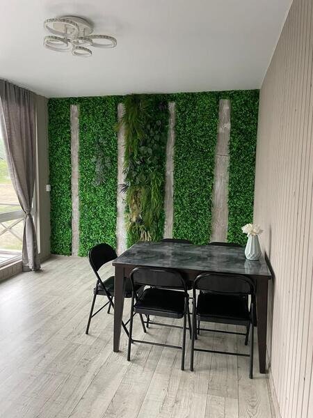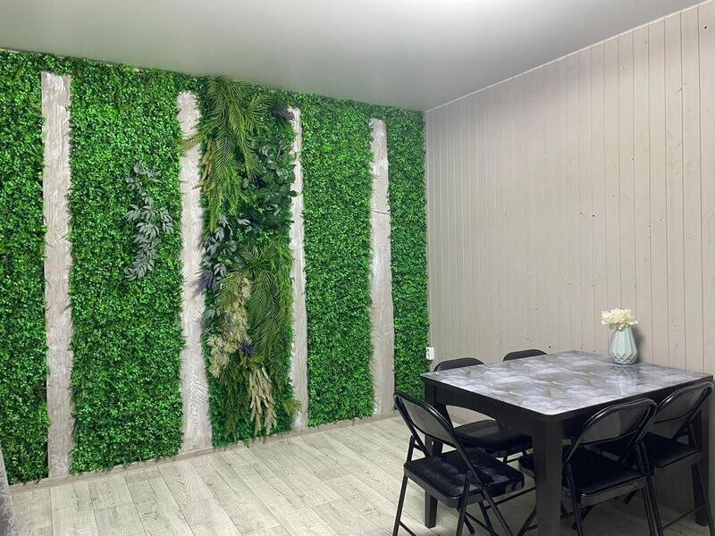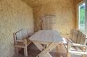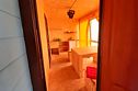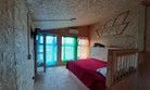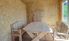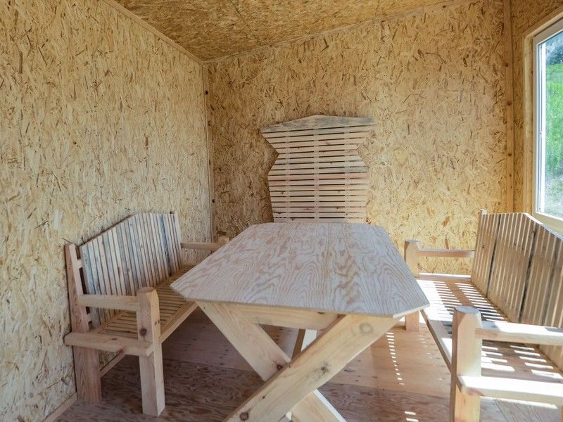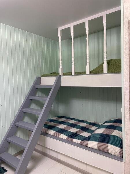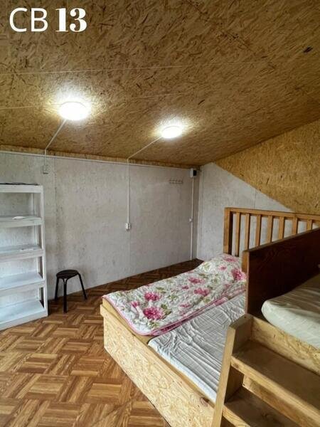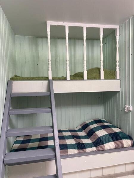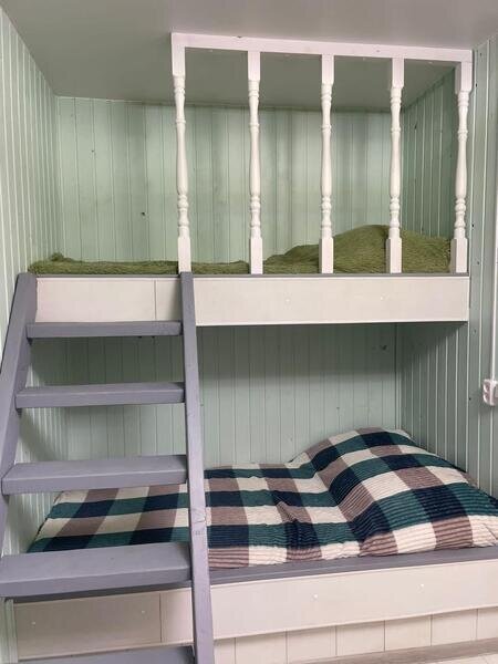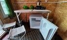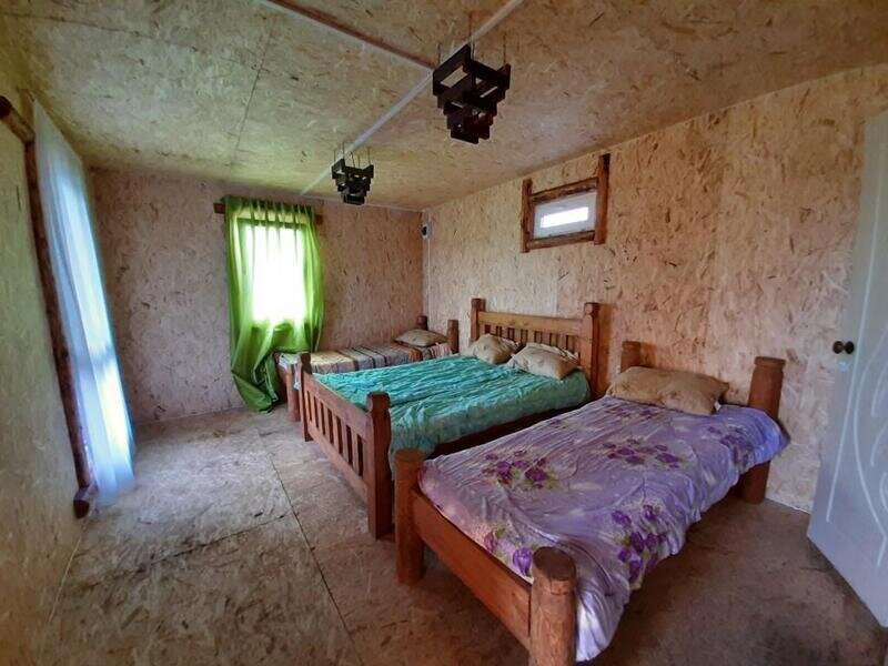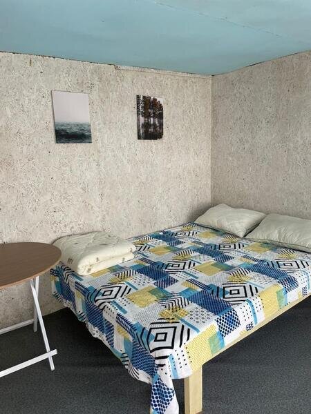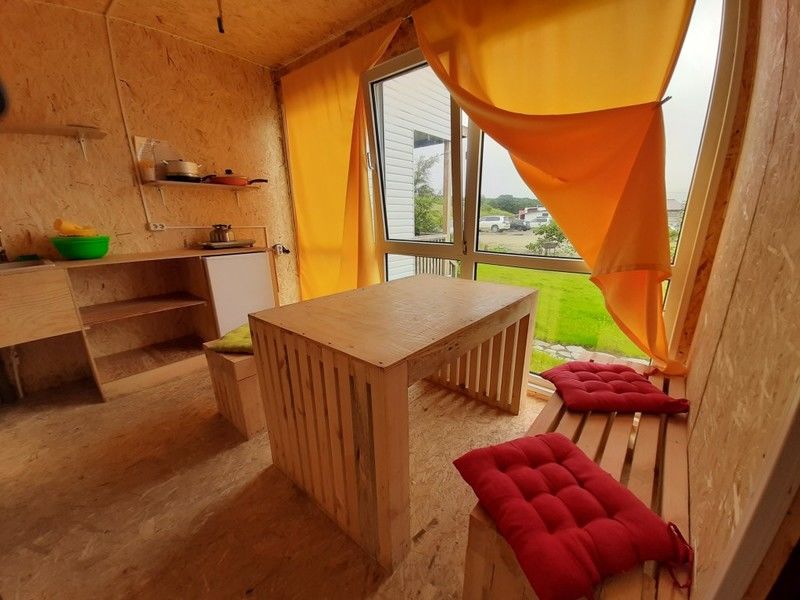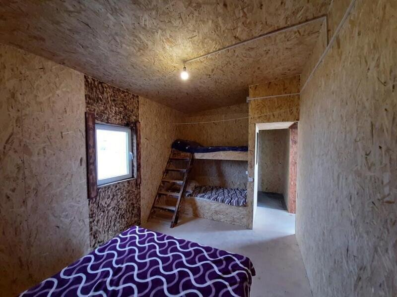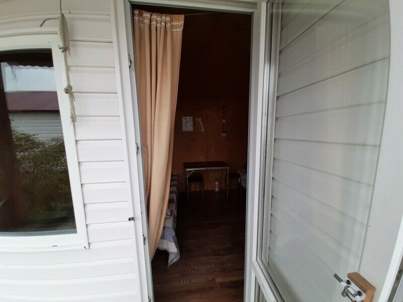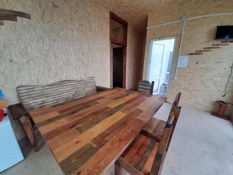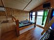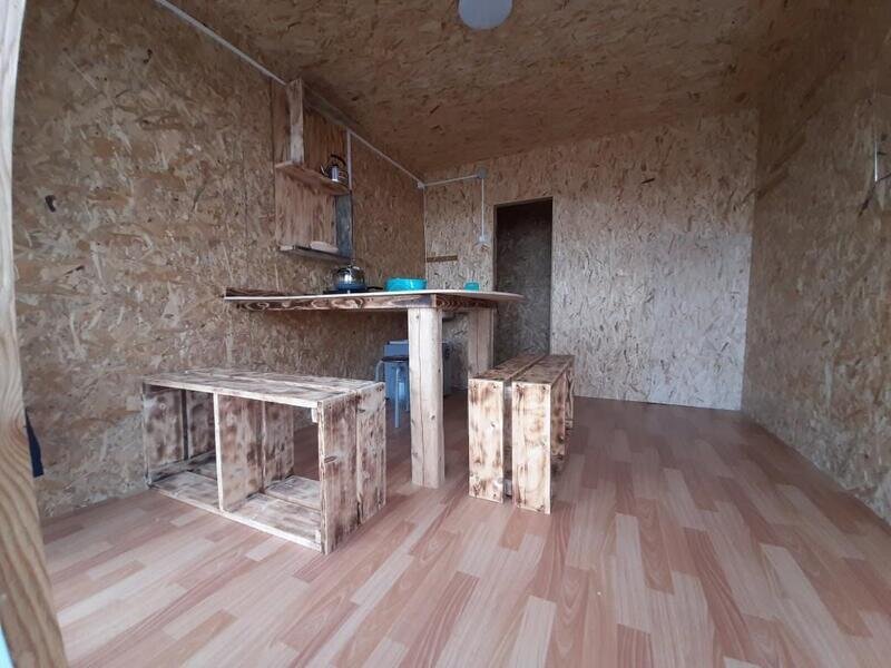 Комплектация - двуспальная и двухъярусная кровати, матрасы, одеяла, подушки, стулья, стол, розетки, холодильник, набор посуды на 4 человека, веник, совок. Душ и туалет в домике. Каждый дом отличается своим неповторимым дизайном, который создавался с любовью к гостям.