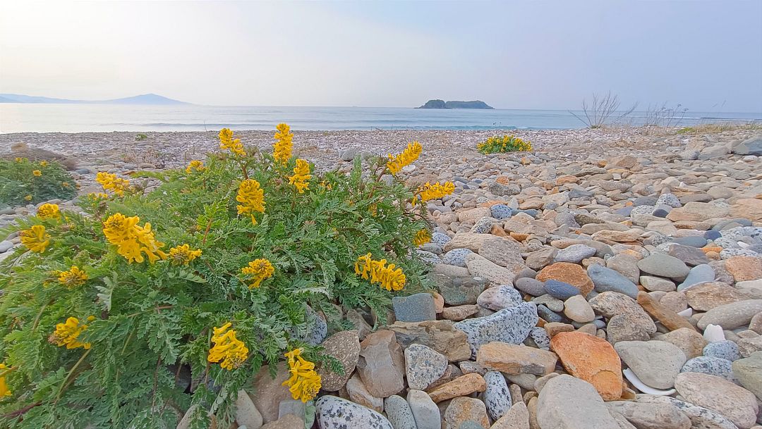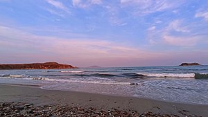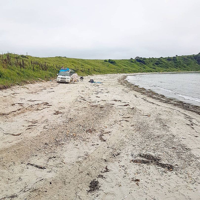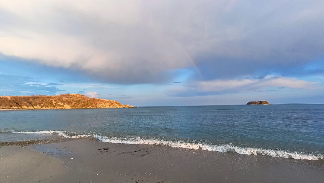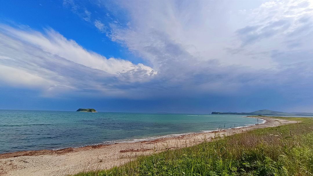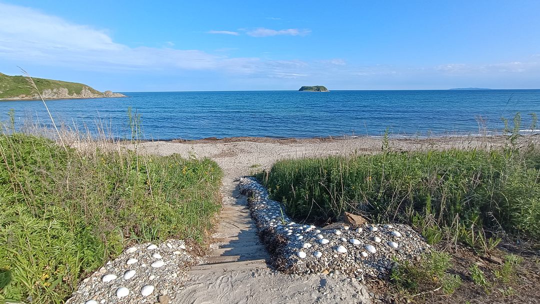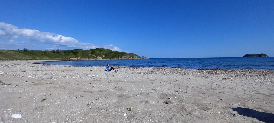 Пляж разный в разных частях бухты: песчаный от мыса и до середины, здесь смешивается с мелкой галькой, к косе постепенно голыши увеличиваются, сама коса из крупных голышей и ракушек. Здесь же под палатки есть лужайка.