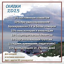 - Предоставляется скидка 15% организованным группам (с гидами, тренерами, педагогами) на номера в гостевом комплексе.