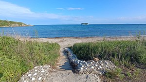 Тип пляжа: песчано-галечныйРасположение: в пешей доступностиПляж разный в разных частях бухты: песчаный от мыса и до середины, здесь смешивается с мелкой галькой, к косе постепенно голыши увеличиваются, сама коса из крупных голышей и ракушек. Здесь же под палатки есть лужайка.