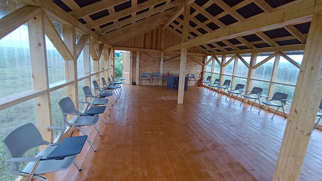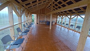 Беседка рассчитана на 45 человек (по количеству человек для единоразового размещения в гостевом комплексе). Группы до 20 человек смогут комфортно разместиться с ковриками для йоги.