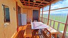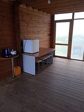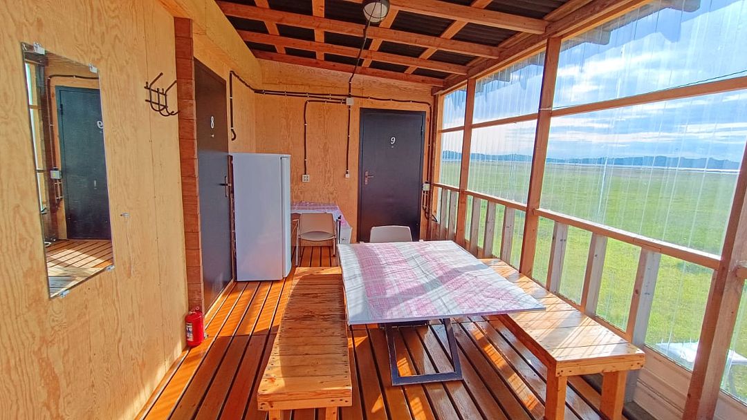 Из номеров есть выход на террасу. На каждой террасе созданы все условия для приготовления, приема и хранения пищи. Здесь есть розетки, чайник, плита, холодильник, скамьи и столы, а также необходимая посуда: кастрюли, сковороды, салатники, тарелки, стаканы, столовые приборы, поднос и разделочная доска.